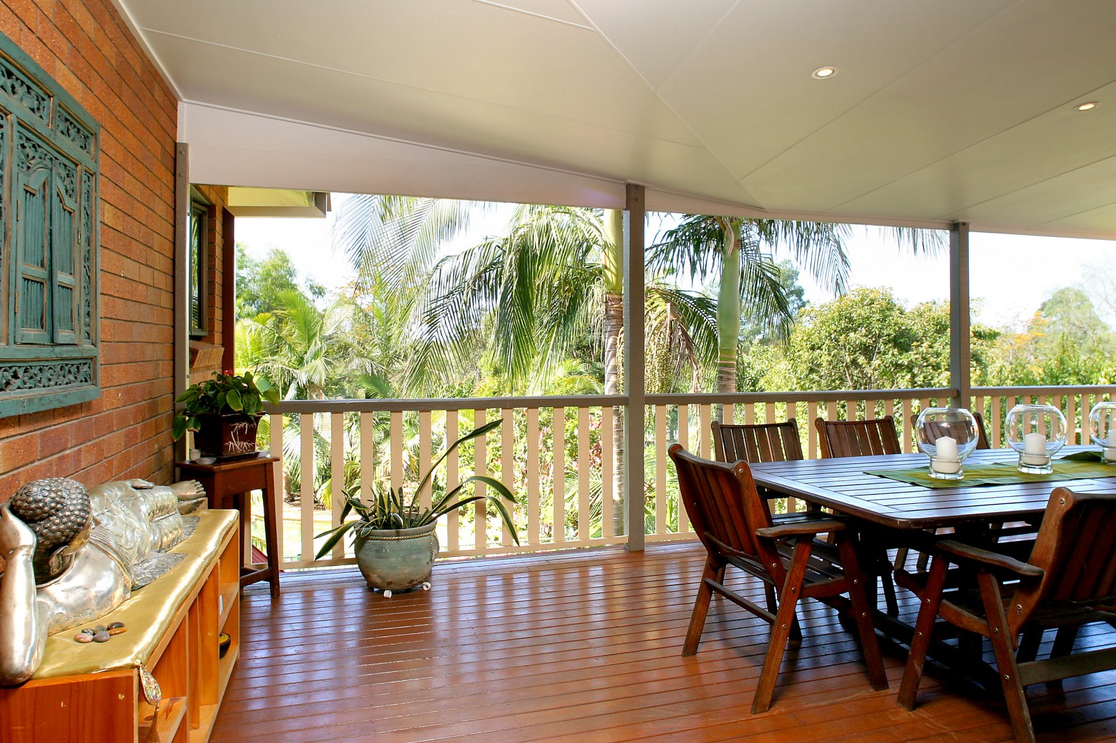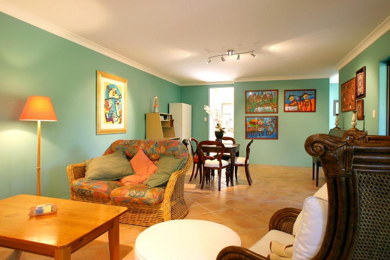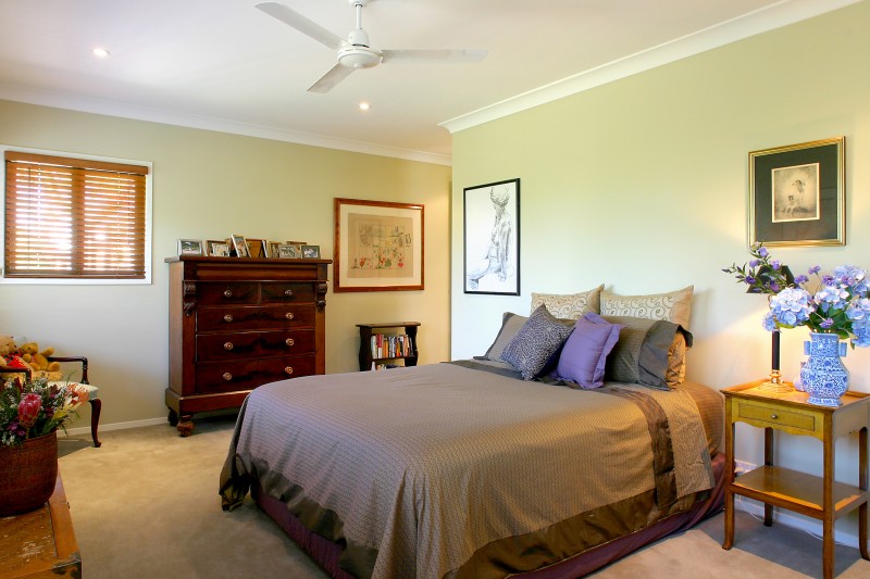 The master bedroom is spacious and serene and features a wi robe, ensuite with spa and twin vanities. Of the remaining 3 bedrooms, the guest room upstairs has its own bathrooms and the 2 bedrooms downstairs form part of the teenagers? retreat, together with another bathroom and a large tiled rumpus area that opens to an outdoor patio. The Balinese theme reappears in the panelled doors of the home office that has built-ins, a large desk area and a computer cabling network.