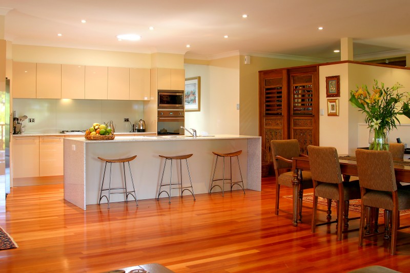 You can pull up a stool to the central island in the well-designed kitchen which puts appliances and cupboards within easy reach. The kitchen features a gas cooktop and quarella benchtops. The living areas upstairs, with separate formal living room, open onto the large covered verandah that overlooks the pool and lush gardens and has views to the city. The upstairs rooms feature polished timber floors and the master and 2nd bedrooms are airconditioned.