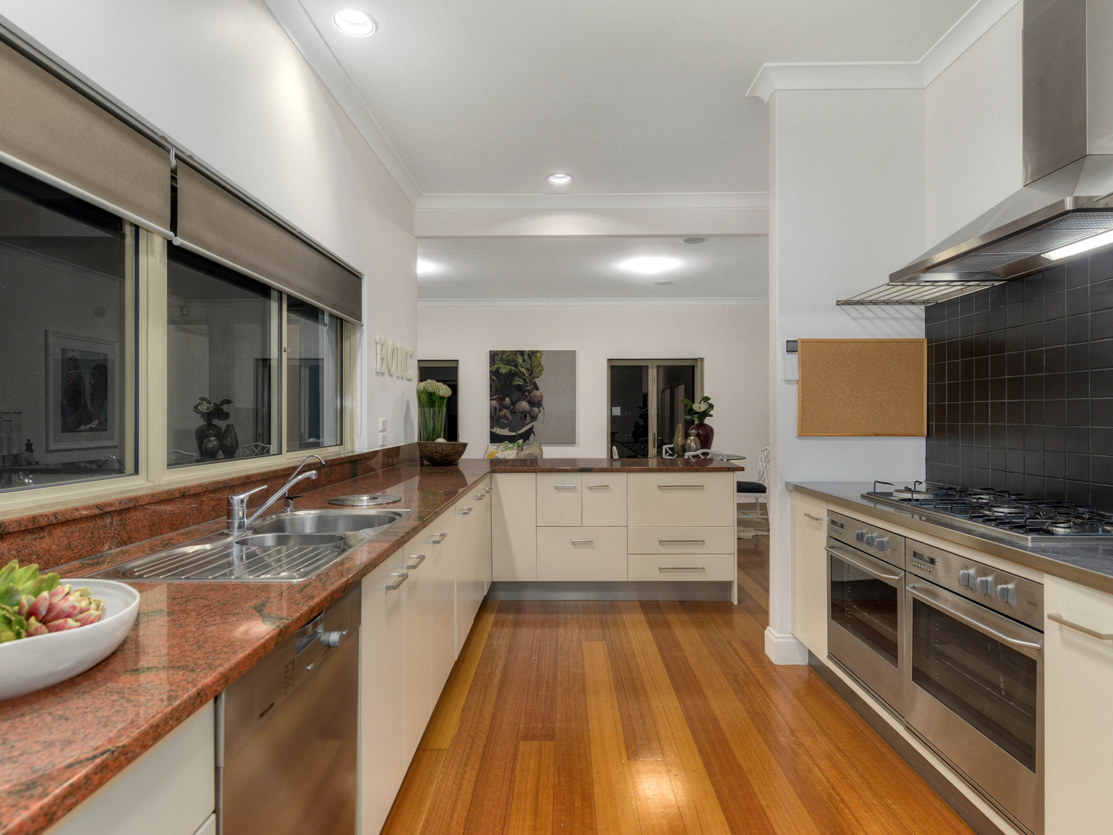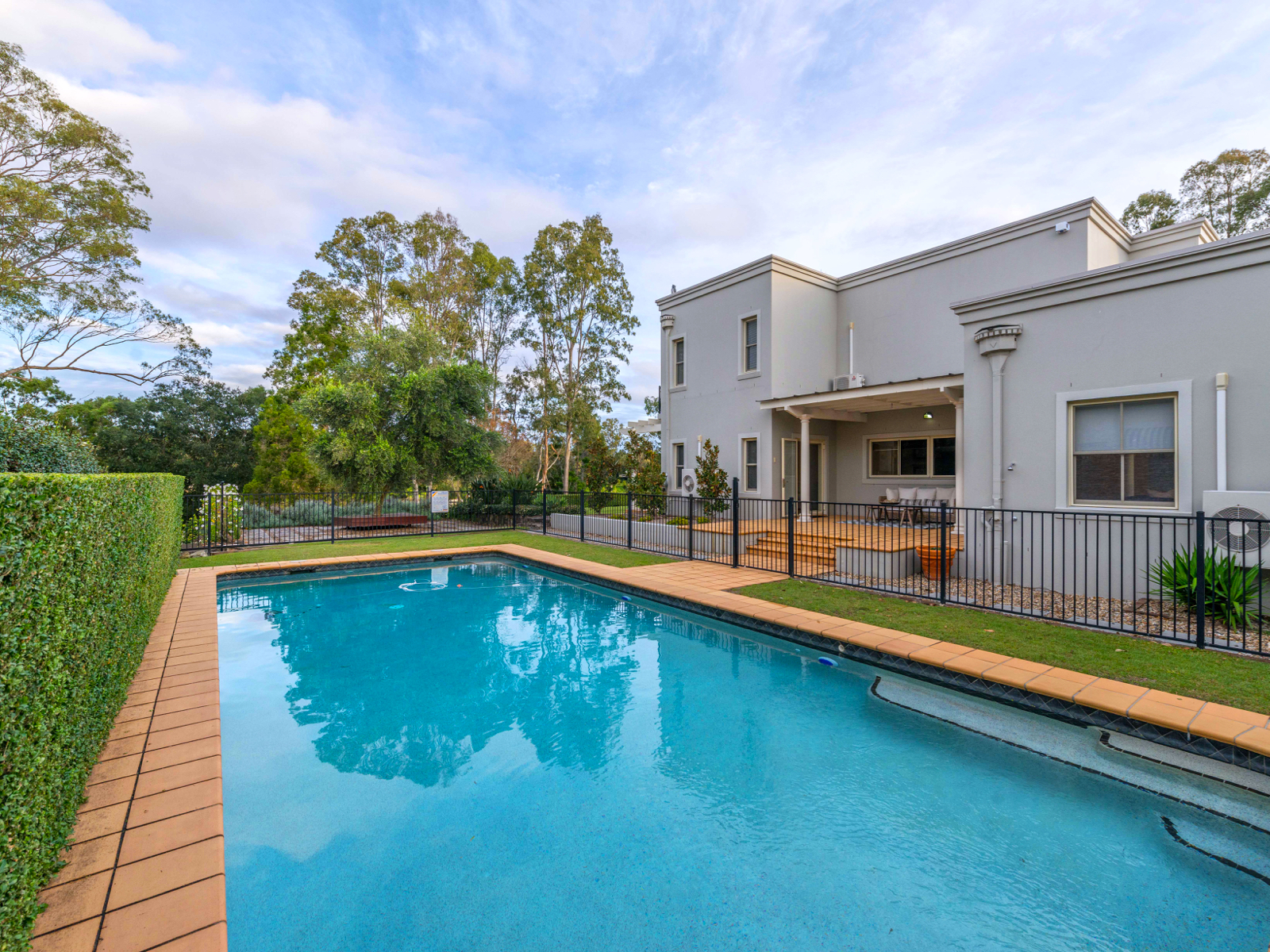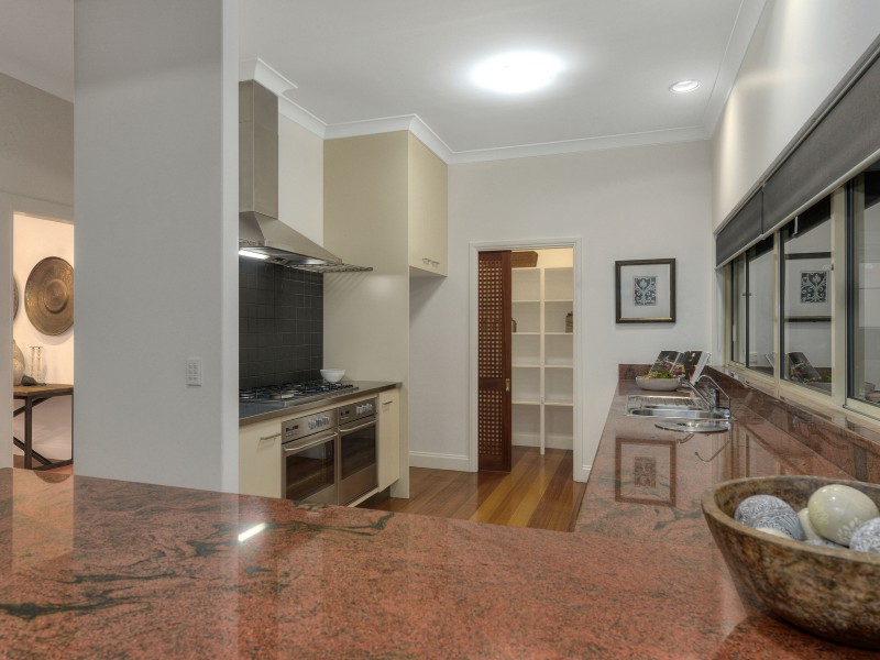 Stepping inside, expansive dimensions and an assiduous attention to detail can be seen throughout, with many features contributing to the stately feel, including the pressed metal feature wall in the upstairs landing that delivers a wonderfully modern take on an old-world finish. Along with being generous in proportion, the floor plan delivers multiple separate living zones that are all able to work independently or together, offering a really versatile solution to suit all the family. The casual living zone is flanked by lawns on one side and the pool on the other, creating light, views and a natural cross ventilation. The kitchen sits centrally within this zone and has been well-designed to suit the rest of the home's style with granite bench tops, a walk-in pantry and a suite of quality St. George appliances (including dual ovens).