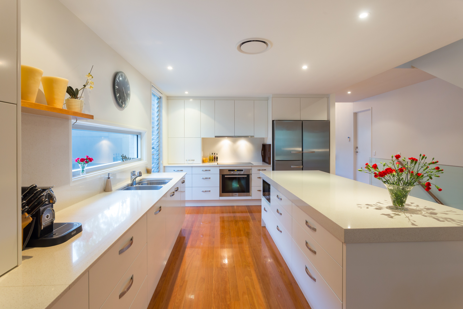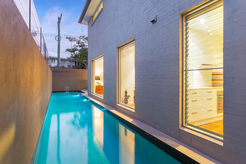 One of the keys to the design is the striking 15m lap pool that runs directly alongside the open plan living area, delivering tranquil water views right into the very heart of the residence. As an additional advantage, the pool also provides a lovely visual connection between the sun-soaked courtyard positioned by the entrance and the rear entertainment deck that looks out into the trees. In this way, the home appears to be surrounded by lifestyle opportunity - all while still being able to maintain a very high level of seclusion. Blackbutt floors run throughout this main level, with an impressive voided entry bathed in warm natural light and large floor to ceiling windows all adding to the contemporary aesthetic. The integrated kitchen is a similarly sleek affair, incorporating Miele appliances (including induction cooktop), Caesarstone benchtops and a large walk-in pantry. A guest bedroom and full bathroom are both located down the hall, as is the large laundry with ample storage space, a work nook and direct access to a large sun-filled drying area.