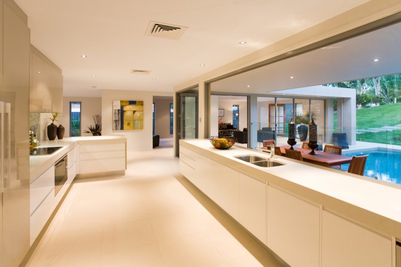 The heated swimming pool is yet another example of this, with the home surrounding and enveloping the water on three sides, giving most rooms water views while also creating a tranquil focus for the entire property. Furthermore, the walls surrounding the pool predominantly consist of bi-folding glass doors that can be pushed right back, essentially creating one seamless indoor/outdoor space. This is also the case with the gourmet kitchen, which runs parallel along the entire length of the pool. Thanks to a set of bi-folding windows along the island bench, it too can become part of this vast space, with the bench cleverly doubling as a bar when entertaining. The kitchen is very much in keeping with the rest of the home, boasting pristine, soft-close cabinetry, stone benches, stainless steel Kleenmaid appliances and an integrated dishwasher to maintain the sleek lines.