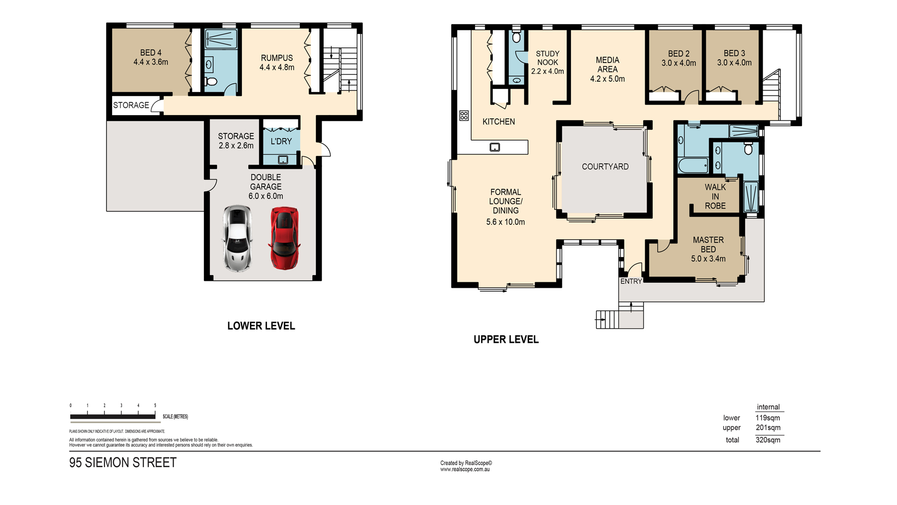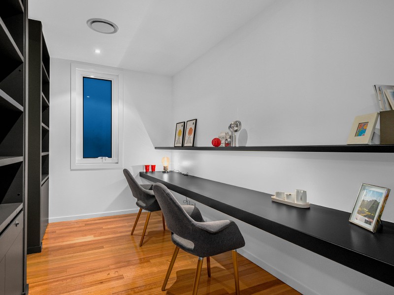 Back inside, the master bedroom boasts a wraparound Juliette balcony, an impressive ensuite with luxurious floor to ceiling tiles, twin vanity and designer fittings as well as a spacious walk-in-robe. The remaining three bedrooms include built-in wardrobes and ceiling fans to keep the whole family happy. Additional spaces include a media room behind the central courtyard on the upper level and a rumpus room, full laundry and storage rooms on the lower level, which is accessed via an elegant, light and bright, internal timber staircase. Other highlights include ducted air-conditioning, timber privacy screens, contemporary colour scheme, security system and double lock up garage.