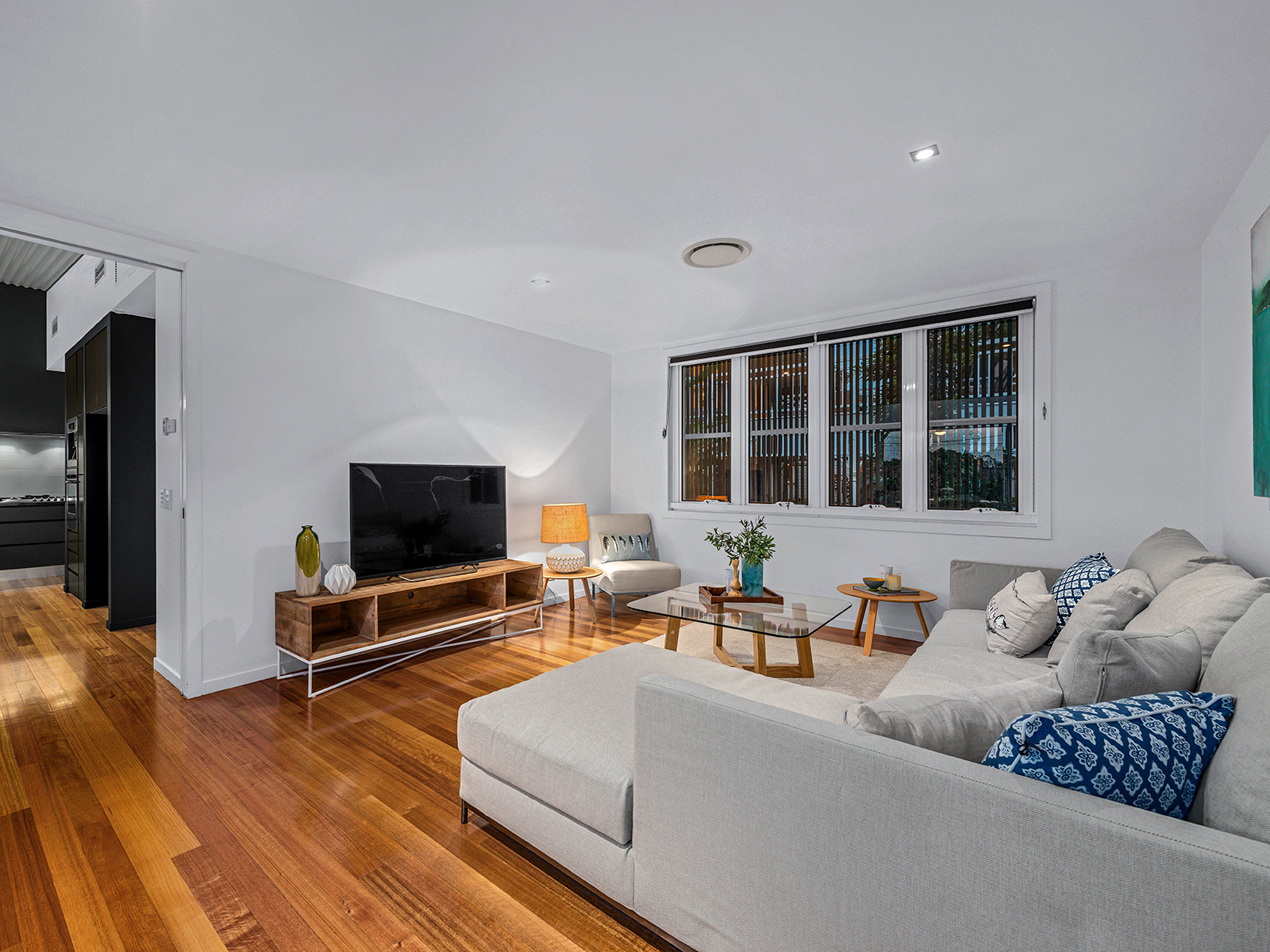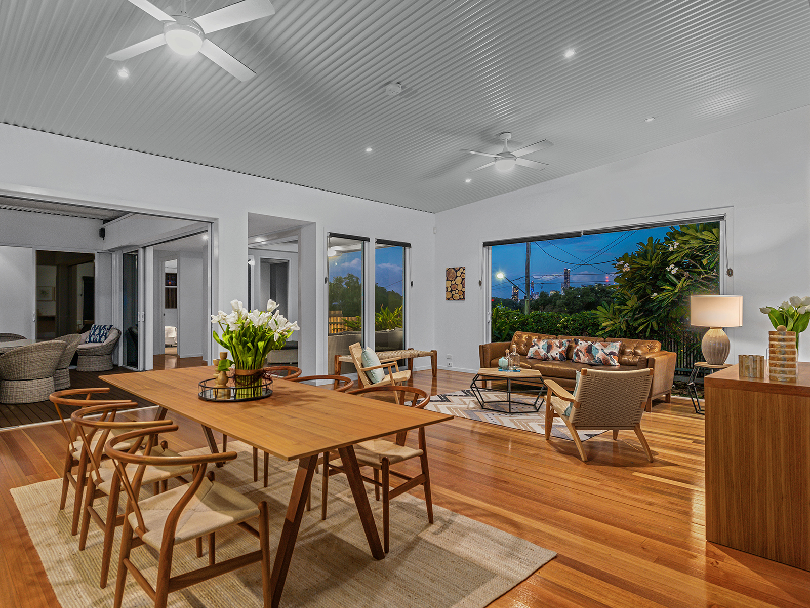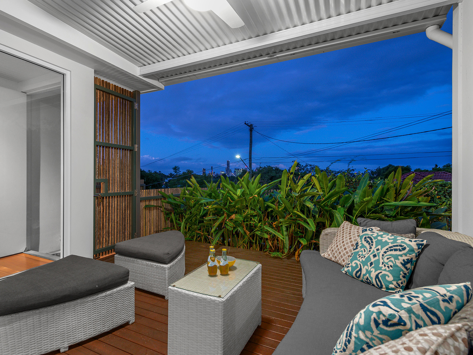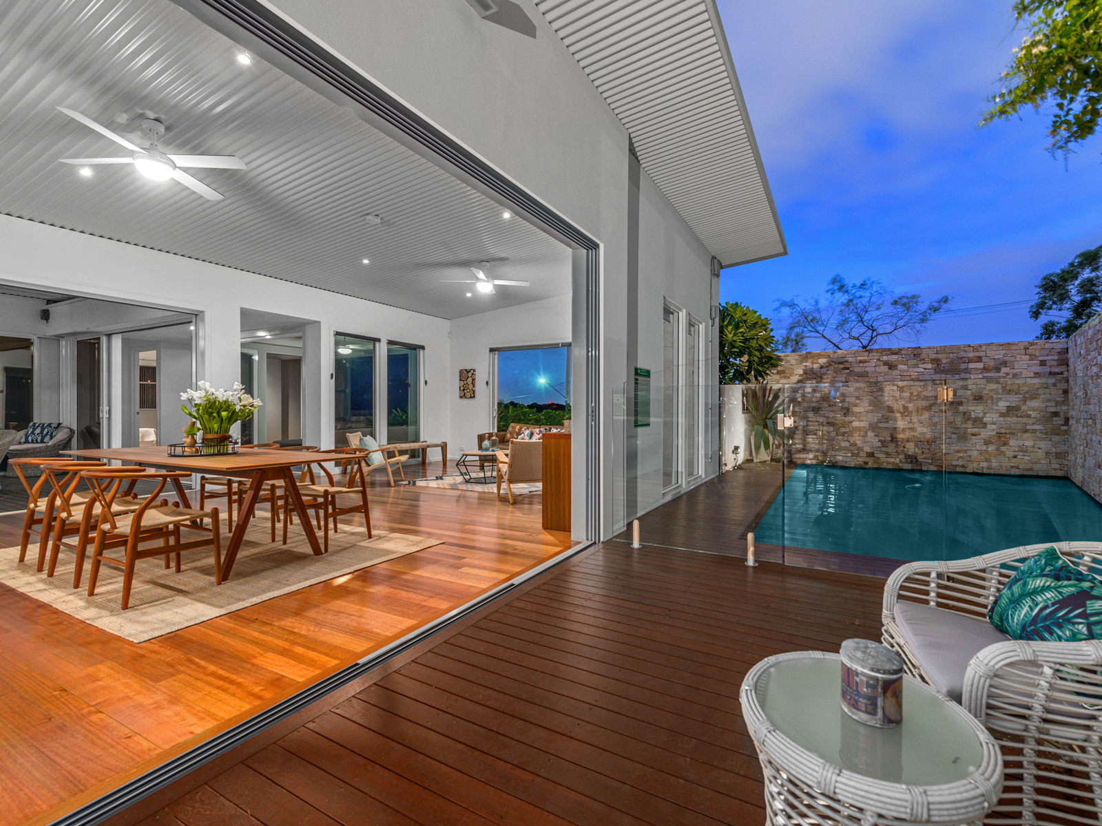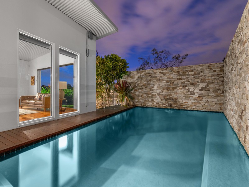 Sliding glass doors open back fully from the living room onto the striking outdoor entertaining area, complete with sparkling pool, seamless glass pool fence, timber deck and stone feature wall. The front deck is the perfect space to relax with a glass of wine while taking in the city views. The beautiful, fully fenced front yard has a lush lawn, frangipani tree and low maintenance gardens including an area downstairs for children to play that creates a welcoming and family friendly space.