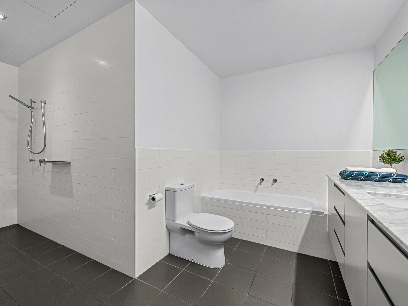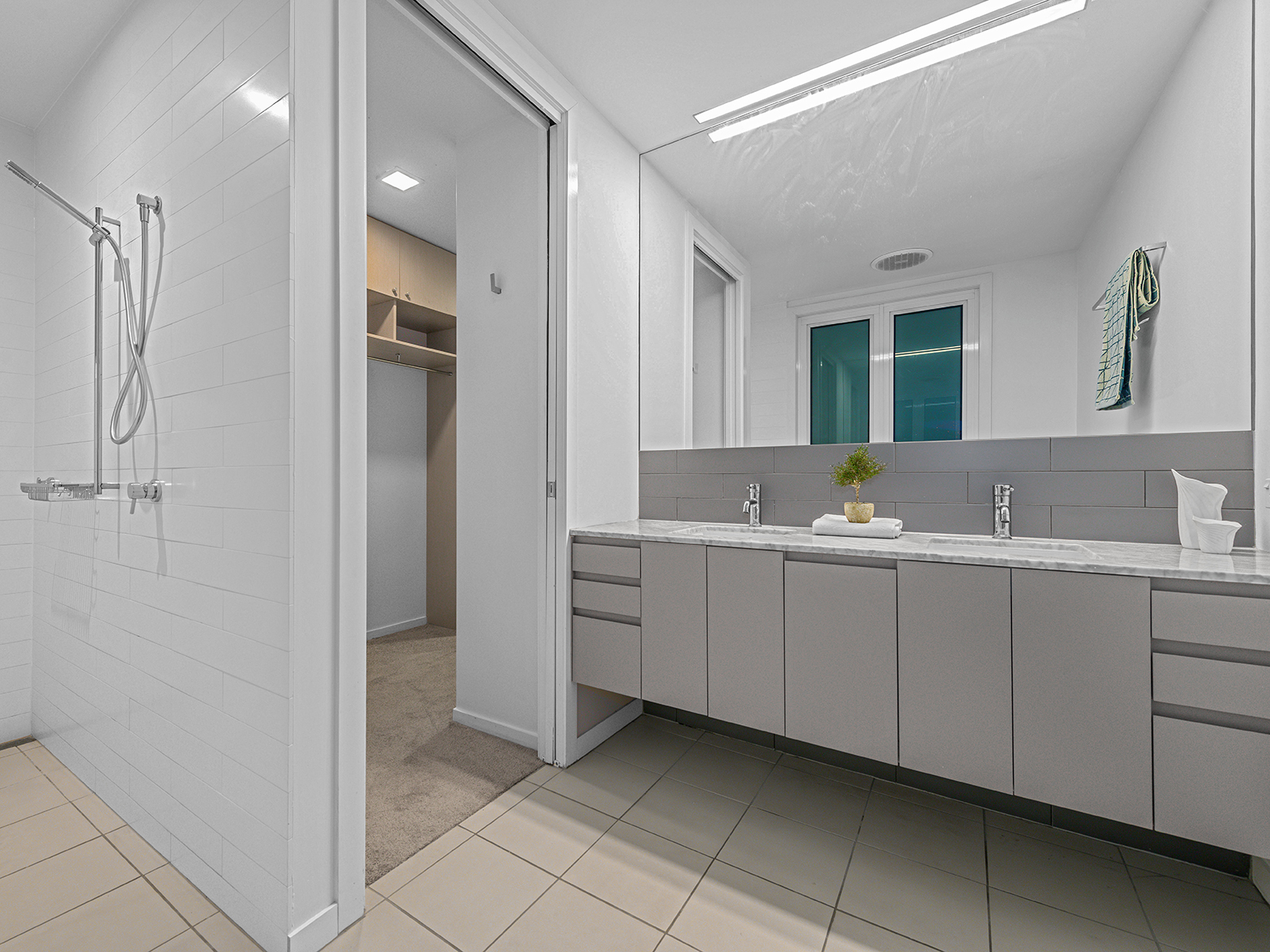 Inside, the home revolves around a central courtyard that allows natural light to pour into the surrounding spaces. Harmoniously integrating indoor and outdoor living, it embraces the city's sub-tropical climate and provides the perfect setting for a relaxed lifestyle. To one side of the central courtyard, the open plan kitchen and living room are ideal for comfortable and convenient family living and entertaining. The kitchen is smart, spacious and stylish with plenty of bench space and work areas tucked away from the main front bench overlooking the living area. Timeless and sophisticated, the kitchen features dark grey two pack cabinets, marble benches, a five-burner gas cooktop, quality Miele stainless steel appliances, inbuilt coffee machine and contemporary lighting.