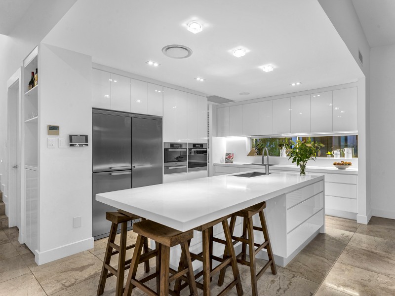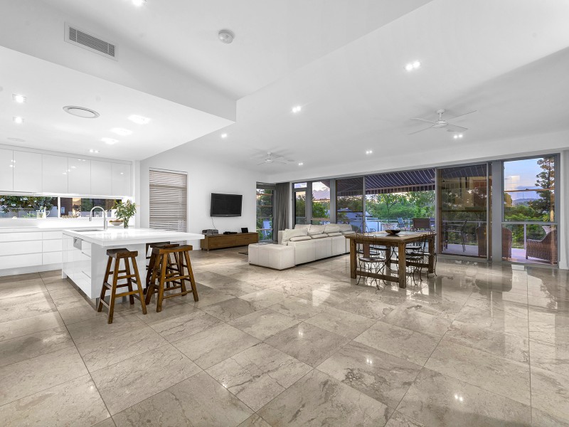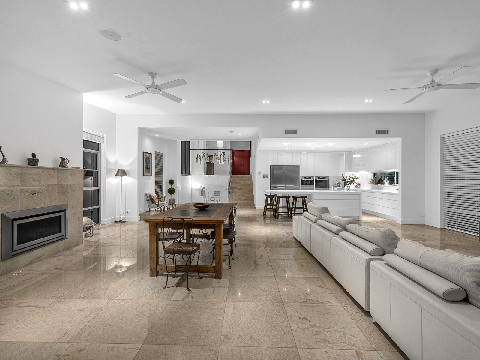 The home's immense floorplan is spread across 550m2 with the main living areas enjoying all the benefits of an open plan design. Marble floors contribute to the elegance of the home, where the dining room, family room and formal lounge with Escea gas fireplace interact seamlessly with the kitchen and flow onto a large entertaining balcony with breathtaking views of the urban landscape and uninterrupted skyline. The state-of-the-art designer kitchen is both beautiful in appearance and functional in form. It features Caesarstone benchtops, Miele appliances, island bench, glossy white two pack cabinetry, an abundance of bench space and storage drawers and cupboards along with a spacious butler's pantry.
