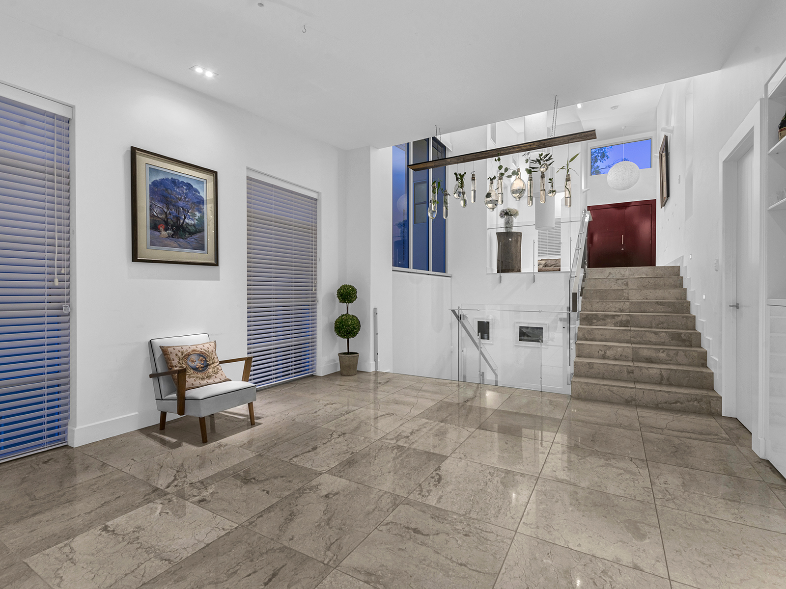 Modern, elegant and sophisticated, this immaculately presented two-storey executive residence located in a private enclave in beautiful St Lucia makes a stunning impression from the moment you arrive. An architectural masterpiece, this home has been built to exacting standards and includes suspended concrete floors and walls. Exceptionally appointed, it excels in every aspect. Its central staircase sits within an enclosed atrium surrounded by floor to ceiling glass walls and clerestory windows that allow natural light to pour into the grand space.