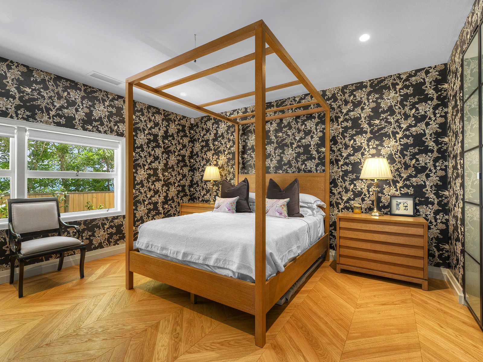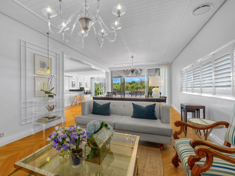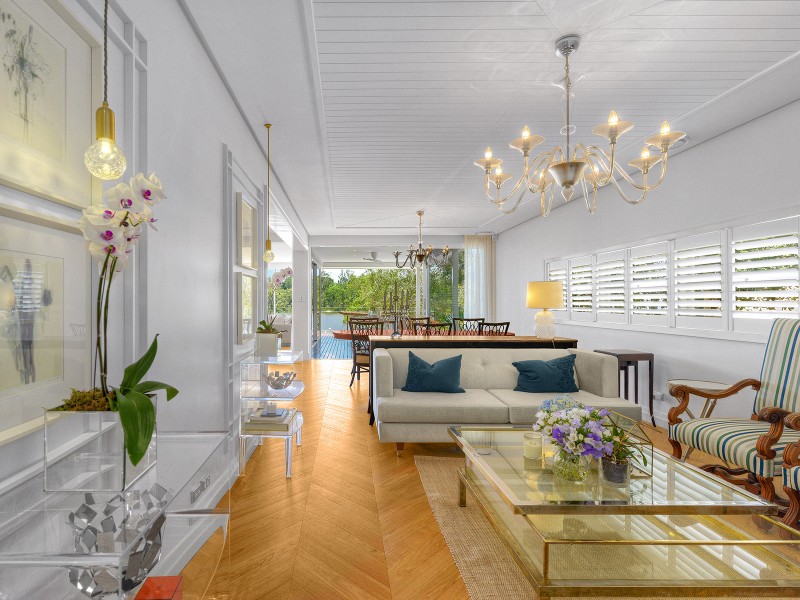 Modern designer living meets warmth and charm in this ravishing two-storey riverfront home located on a private and tranquil allotment in beautiful inner-city Fairfield just four kilometres from the Brisbane CBD and with approved plans for an inground pool. With a superb floorplan and 6 star finishes straight out of a Vogue Living magazine, the attention to detail in this extraordinary home is evident at every turn. Arrive at the striking ebony front door and inside the elegant foyer where stylish chevron patterned European oak flooring begins and continues throughout the home.