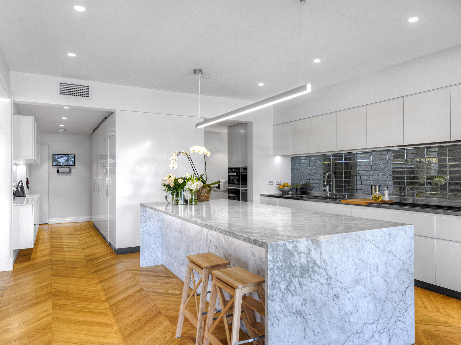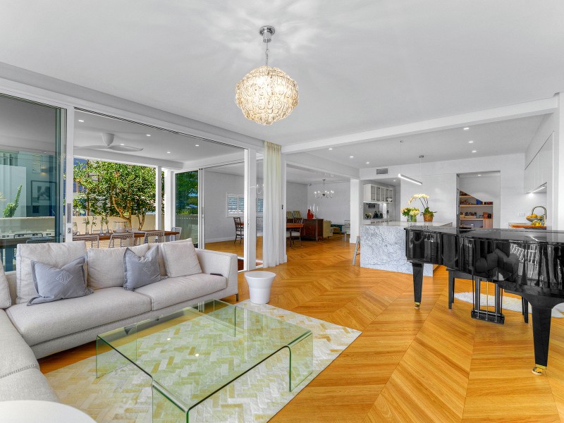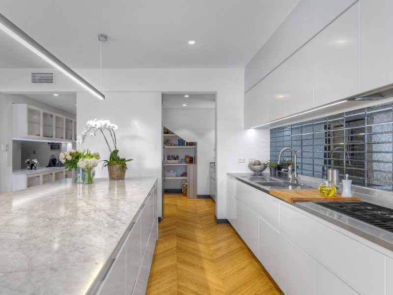 The designer kitchen is a dream for families, foodies, gourmet cooks and entertainers alike. Brimming with top of the line features, it includes three integrated Miele ovens, premium Italian gas cooktop, integrated fridge/freezer, three integrated dishwashers, Zip hydro tap for hot/chilled water, top of the line and super quiet Insinkerator, Carrara marble island bench, stainless steel back bench, appliance bench and two pack joinery. In the open plan lounge, dining and family rooms, ornate ceilings are complemented by stunning Italian Murano glass chandeliers, Lee Brown crystal pendants and ornate wall inlays. The rooms connect seamlessly to the stylish undercover deck in a supremely sophisticated display of indoor/outdoor living.