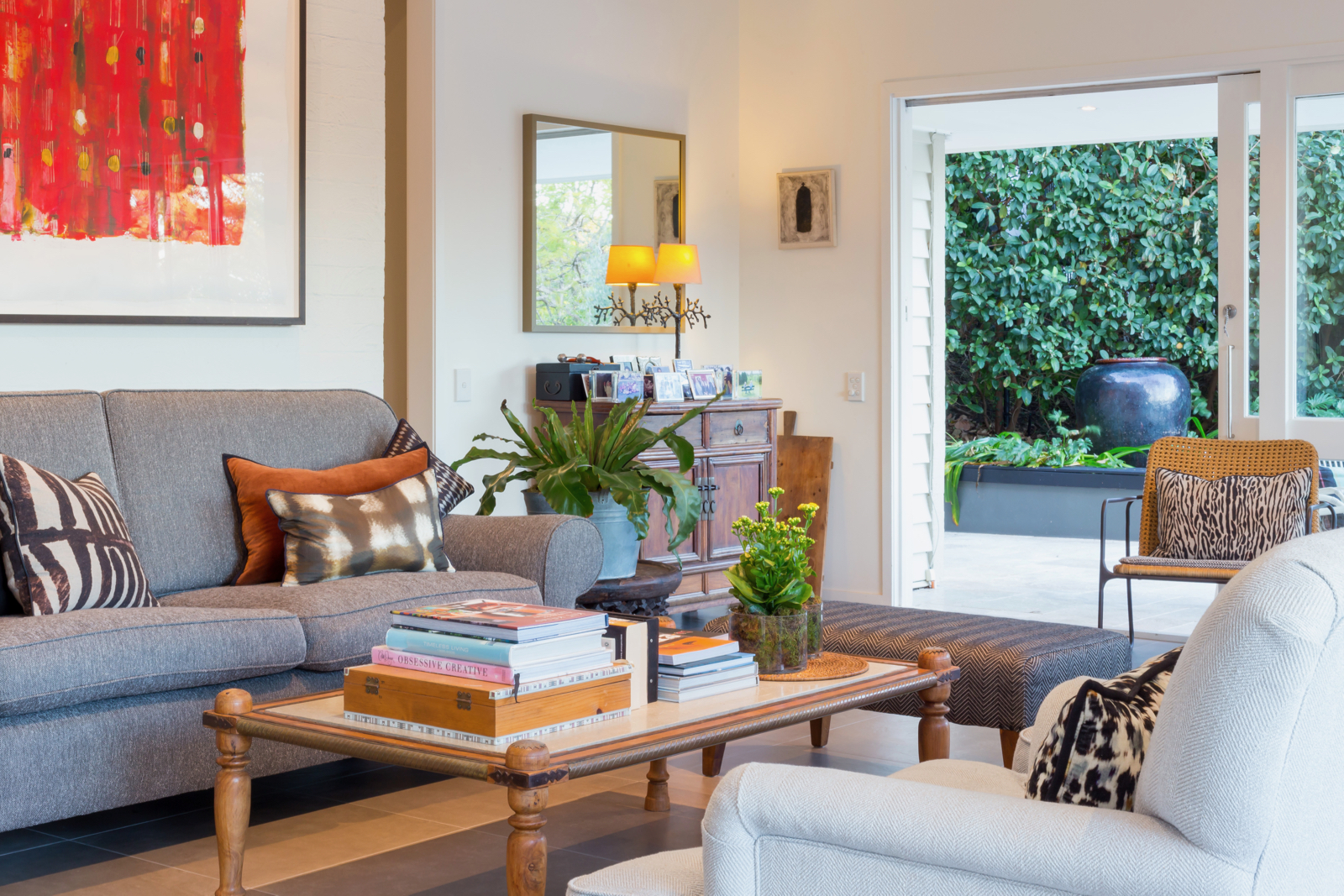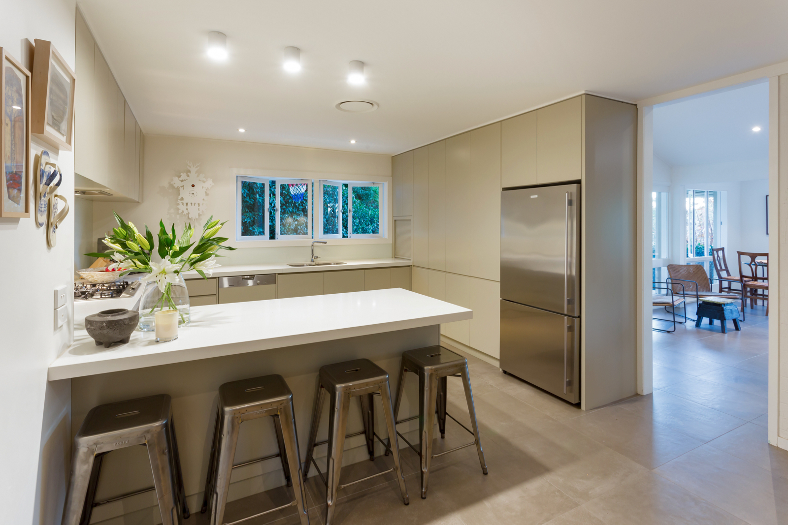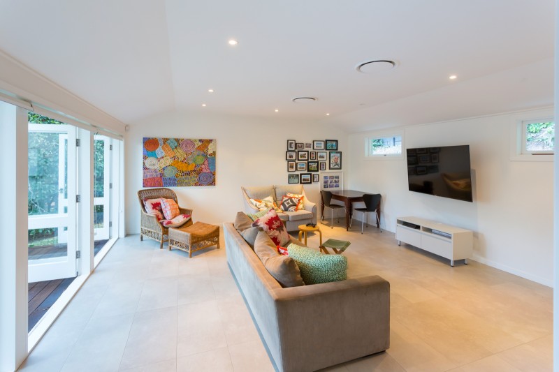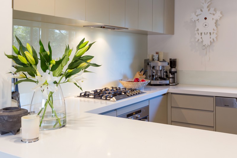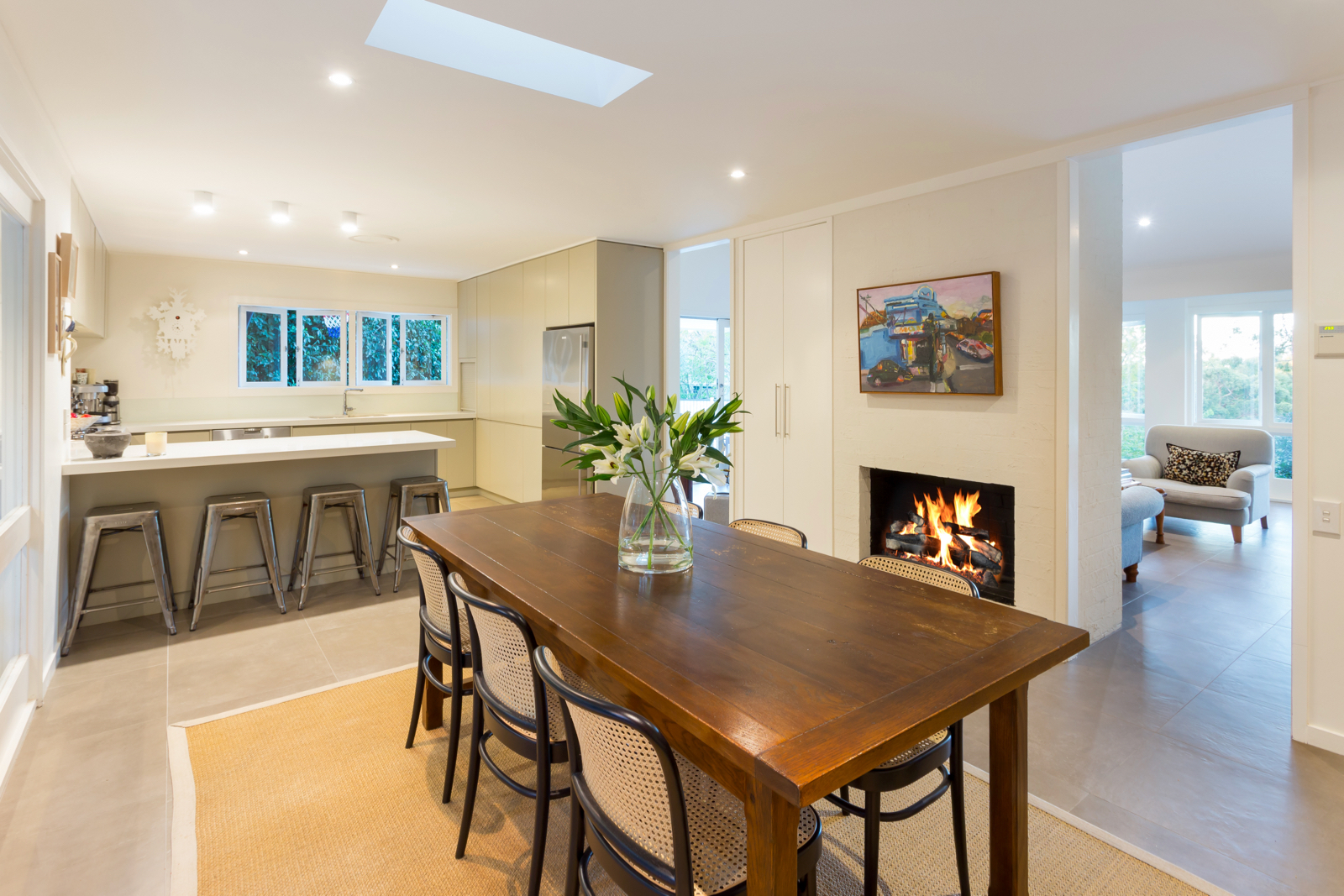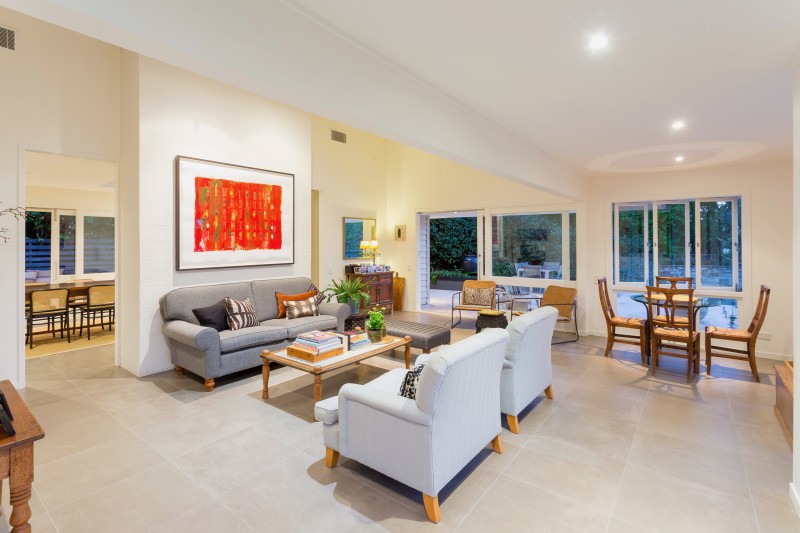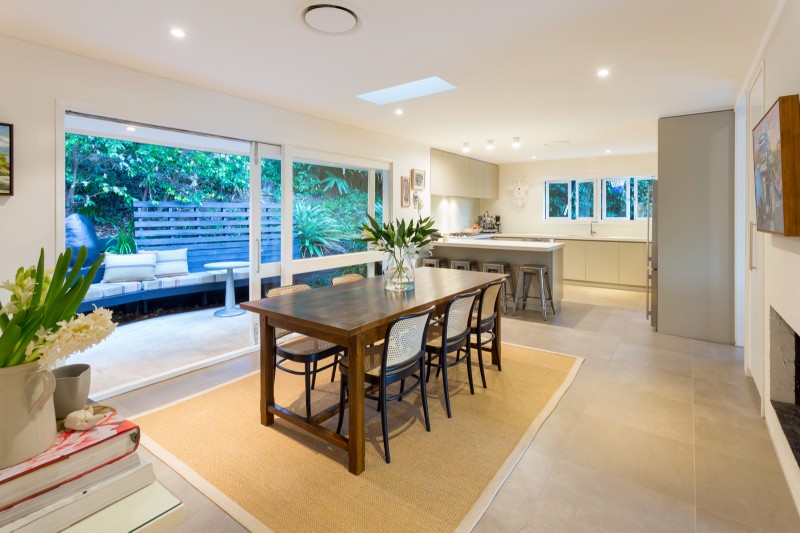 The open plan kitchen and dining room with a cosy built-in fireplace provides a modern and homely space for the family to come together and reconnect. In the warmer months or on those bright winter days, slide open wide glass doors onto the wrap-around patio with inbuilt timber bench seats to expand your relaxation and entertaining space. In the light and bright gourmet kitchen, thick stone benchtops wrap around the room which includes charming casement windows, a breakfast bar, contemporary streamlined cabinetry, glass splashback, gas cooktop, integrated dishwasher and Miele appliances.