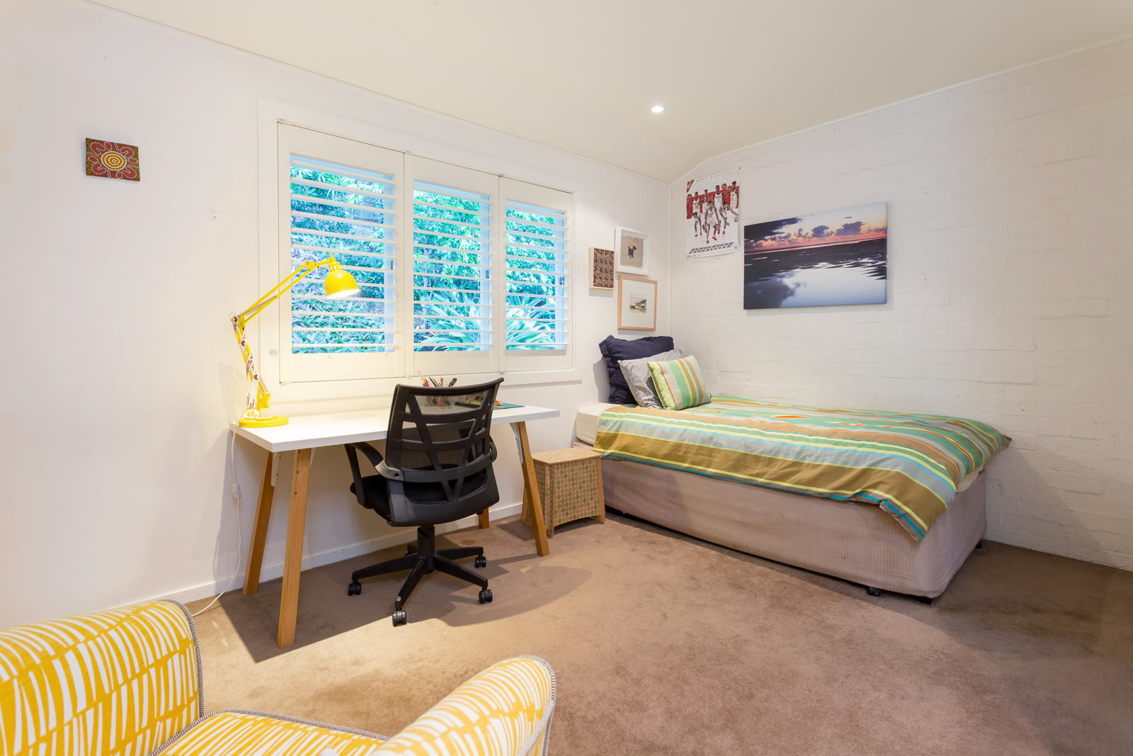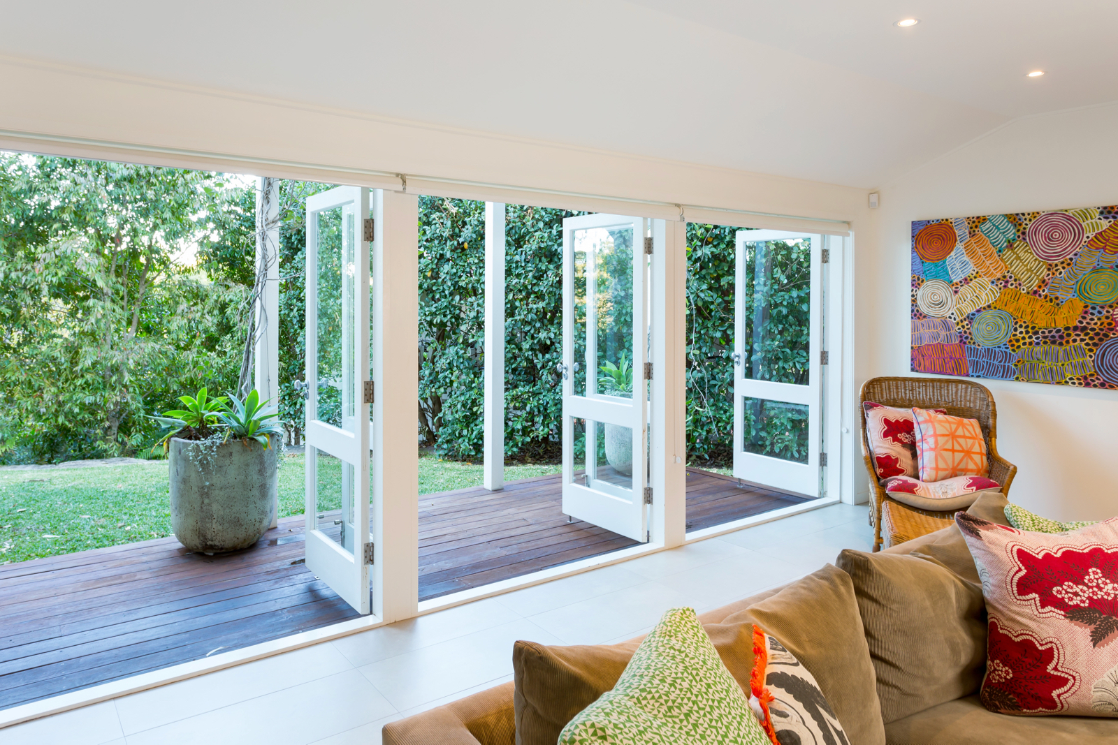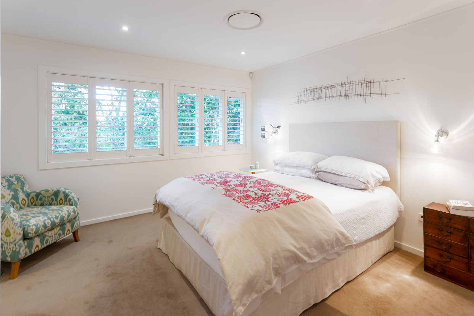All bedrooms feature carpets for underfoot warmth and softness as well as stylish plantation shutters on casement windows. In the private and tranquil main bedroom, the large windows look out to the luscious front gardens while a smart and stylish ensuite helps family life flow smoothly. In the large family room, high ceilings create an extra sense of grandeur and space, built-in cupboards provide plenty of storage and well-positioned clerestory windows maximise privacy and room functionality. Large glass doors open onto a second timber deck and gardens creating a wonderful flow between indoor/outdoor living.