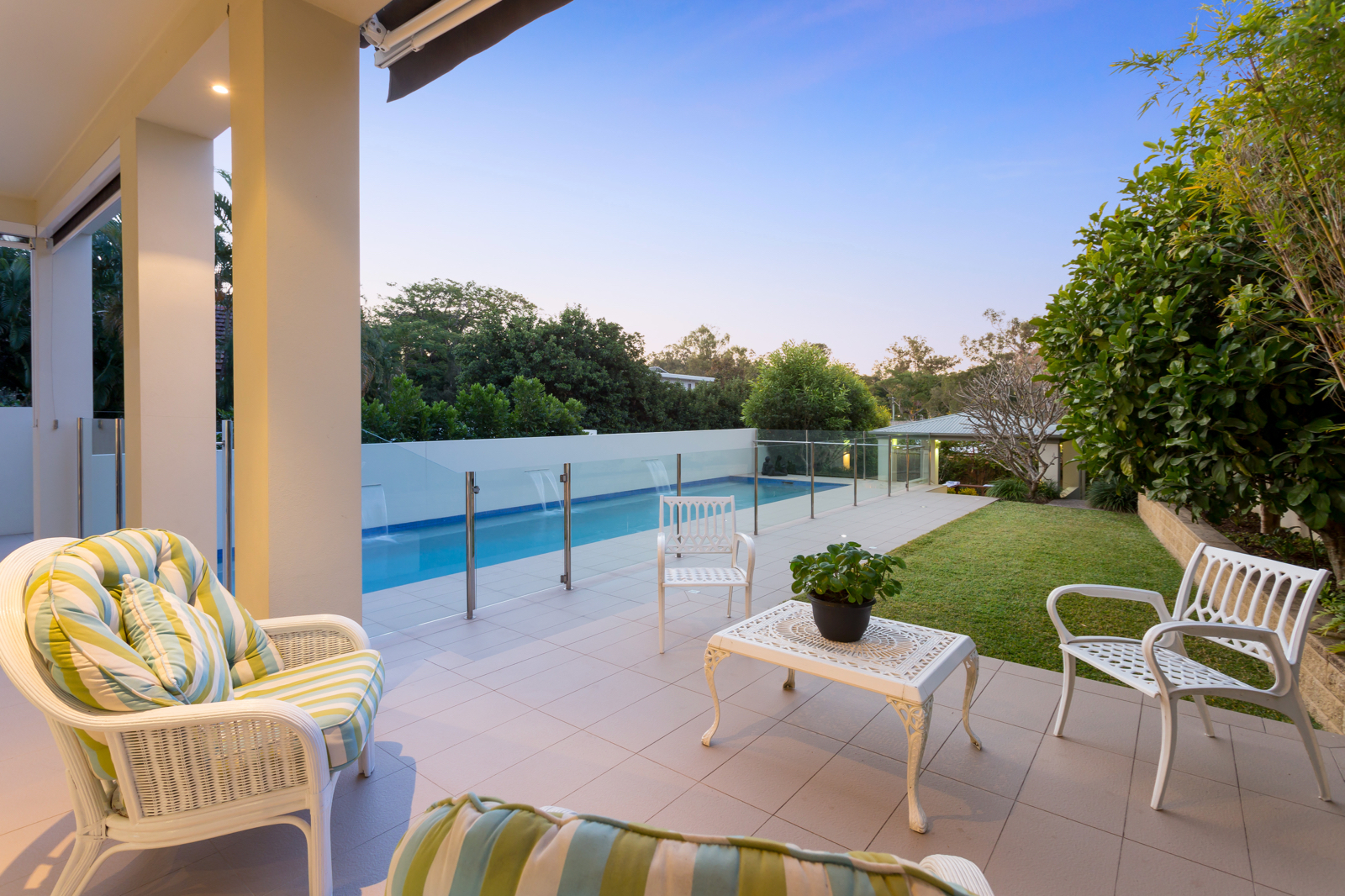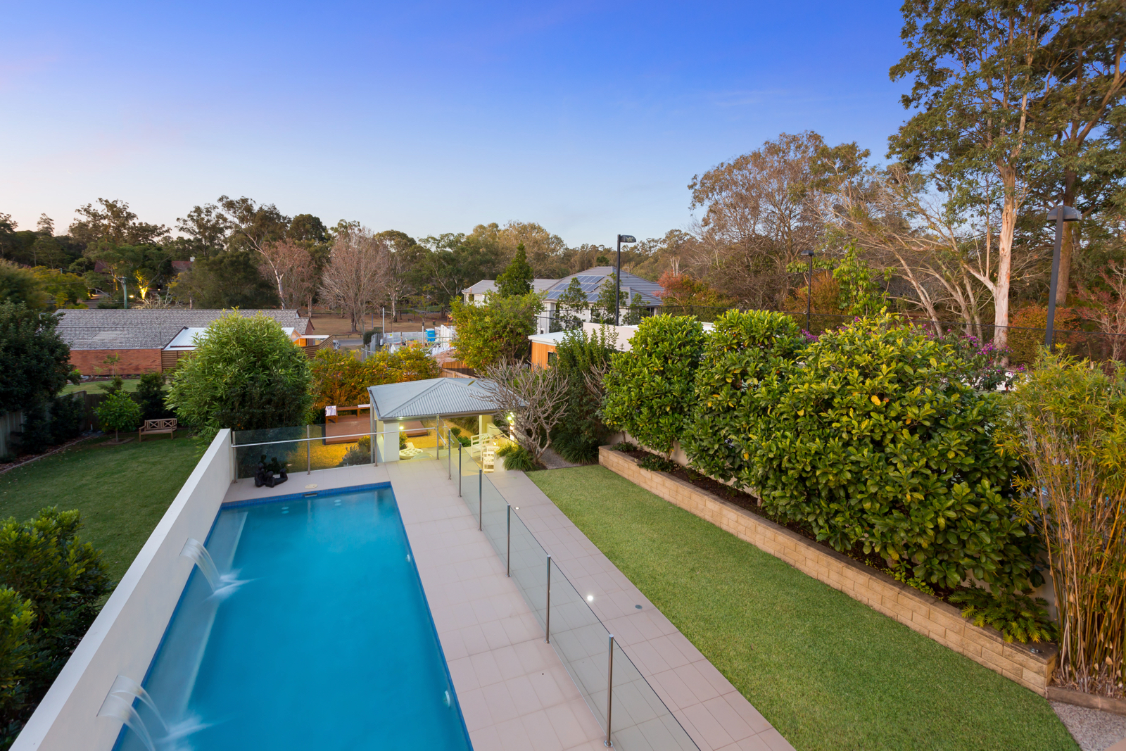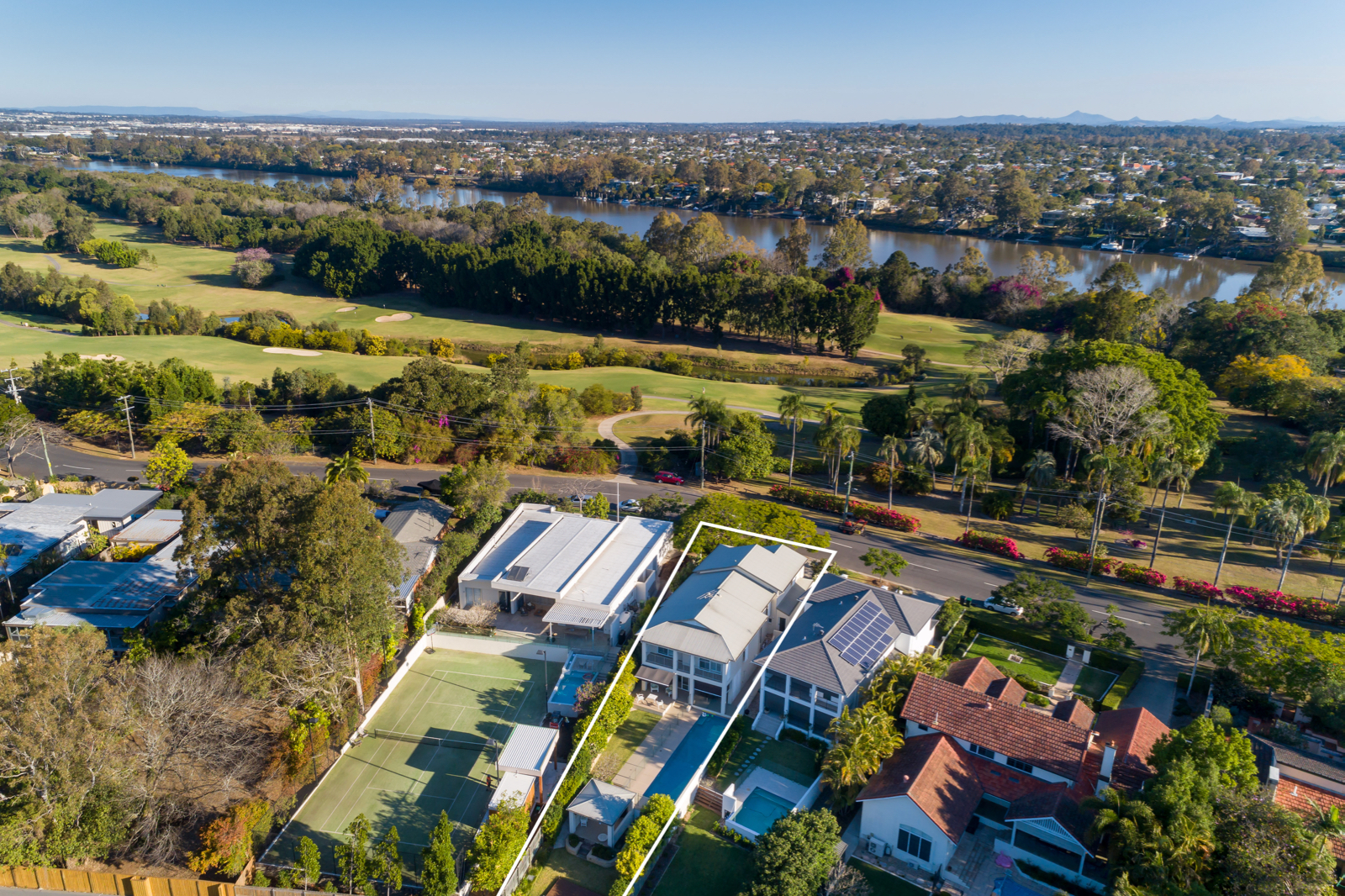 This modern luxury two-storey family home with an idyllic north-facing position is architecturally-designed and located on a quiet and respectable street on a large and spacious allotment measuring 764m2 with glimpses of Indooroopilly Golf Course from its multiple indoor and outdoor living and entertaining areas.