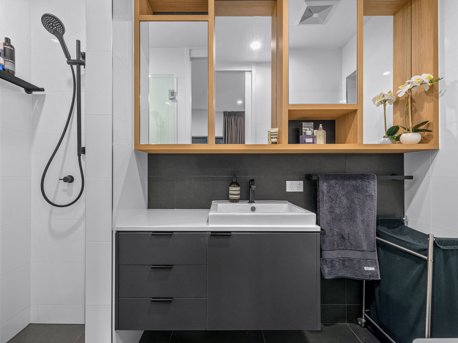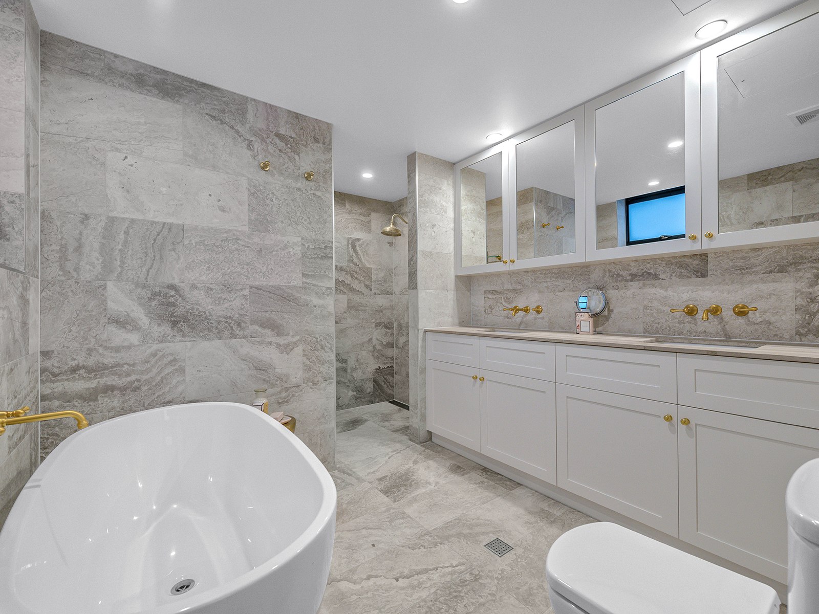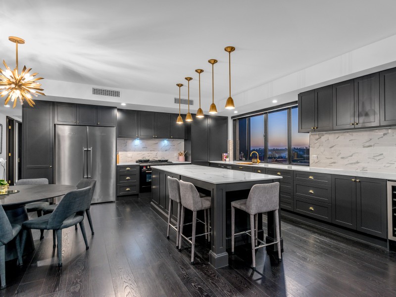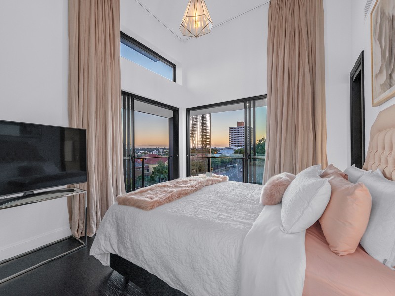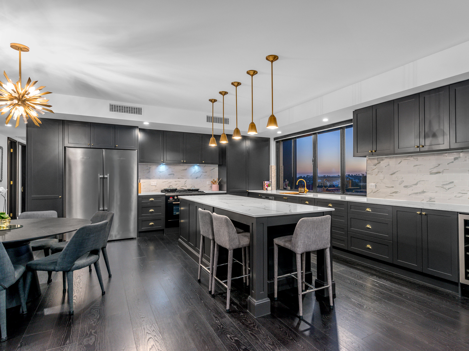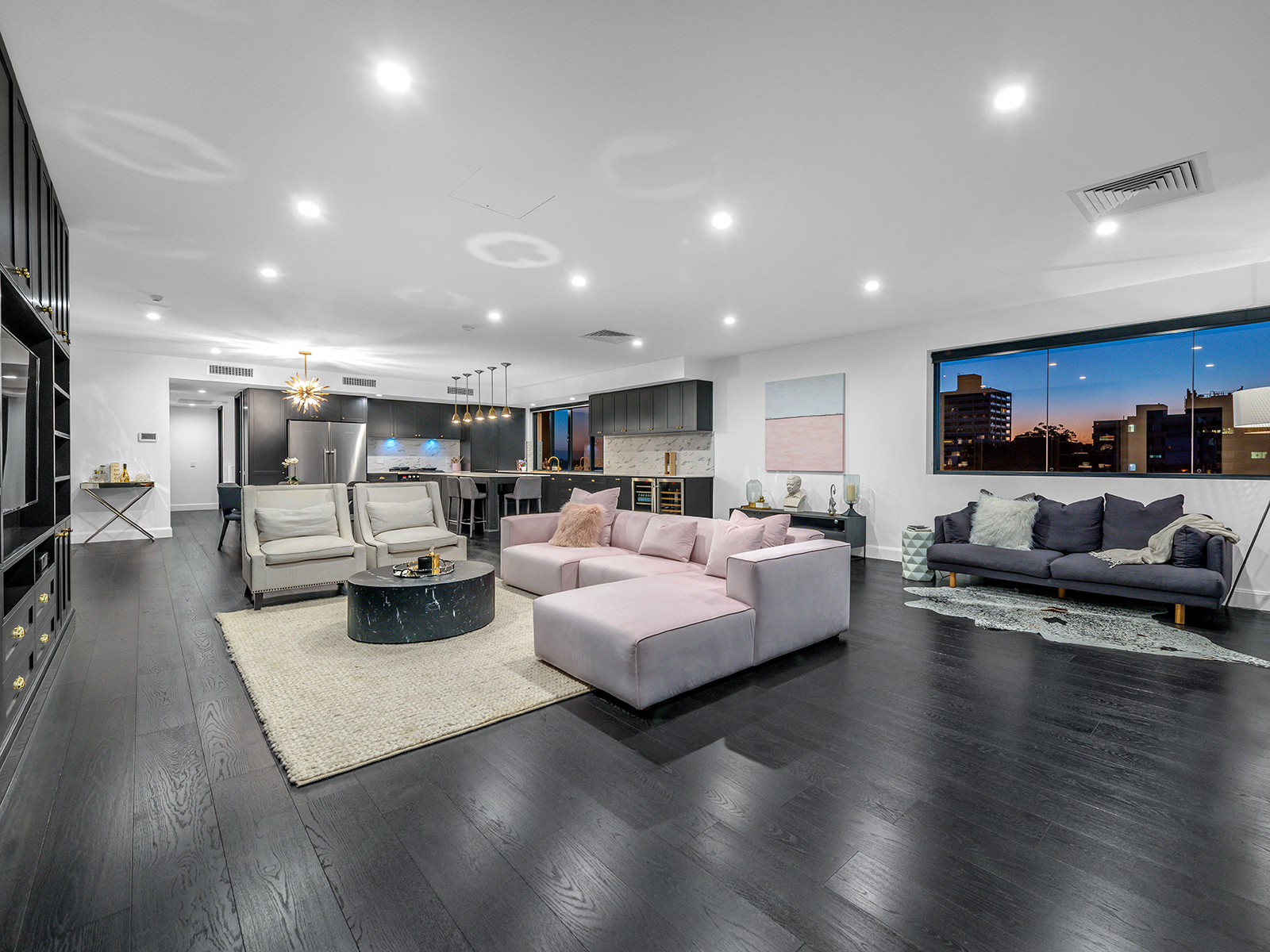 The exquisite master bedroom boasts its own wrap-around balcony with glorious views - the perfect space to unwind with a glass of wine as the sun goes down. There is also a designer walk-in-wardrobe, motorised curtains and a luxurious ensuite with marble wall and floor tiles, island bath, double vanity and luxe tapware. The top floor is also home to a large separate media room featuring custom joinery, a bedroom with ensuite and a separate laundry. Access the lower level via an elegant black spiral staircase which opens onto a third living area and fully equipped second kitchen. There is also a bedroom with ensuite, a bedroom opposite the main bathroom and a second laundry. It's the perfect self-contained living space for adult children or grandparents. This incredible penthouse also offers ducted air-conditioning, two side-by-side car parks, intercom and security system.
