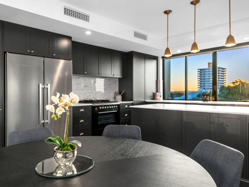As the doors of the lift open, step into the generous and sophisticated open plan living rooms. Sleek, modern, bold and stylish, the apartment is filled with natural light pouring through large windows onto ebony oak floors and offers stunning views from every vantage point. The luxe designer kitchen looks as though it has been lifted straight off the pages of Vogue Living. The attention to detail is exemplary and the entire space exudes an elegant and stylish quality that is truly rare to come by. A beautiful marble island bench sets the luxe tone, reinforced by sophisticated matt black cabinetry, golden handles, imported tapware, marble splashback, wine fridge and ILVE appliances including gourmet oven and cooktop. Imported pendant lights hang above the island bench and an exquisite statement light illuminates the dining area. The spacious living room with custom joinery completely opens up through bi-fold doors onto the large entertainer's deck creating a seamless connection between indoor/outdoor living. There is plenty of room for both living and dining where you can take in the full glory of the incredible unobstructed views of the city, mountains and hinterland.