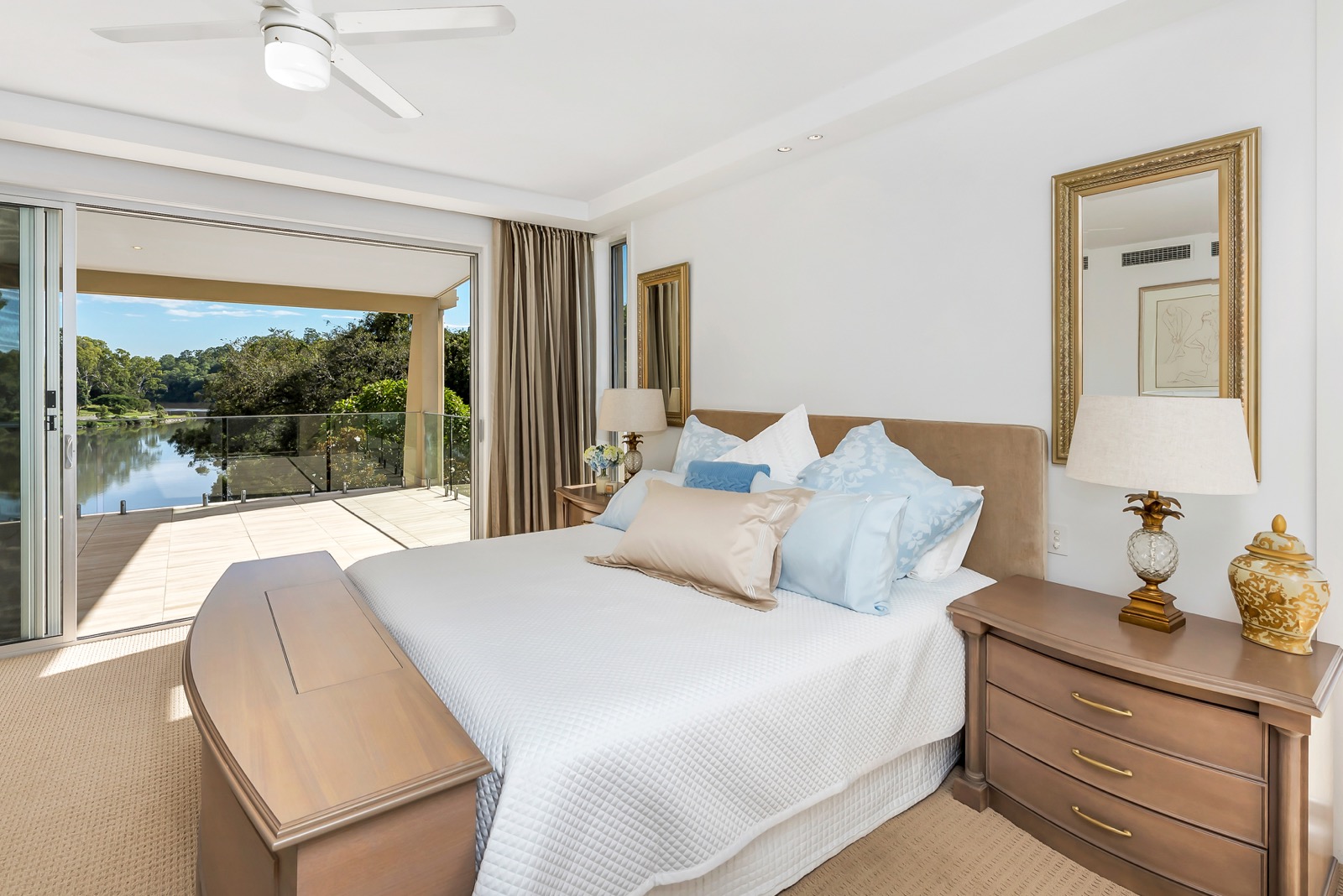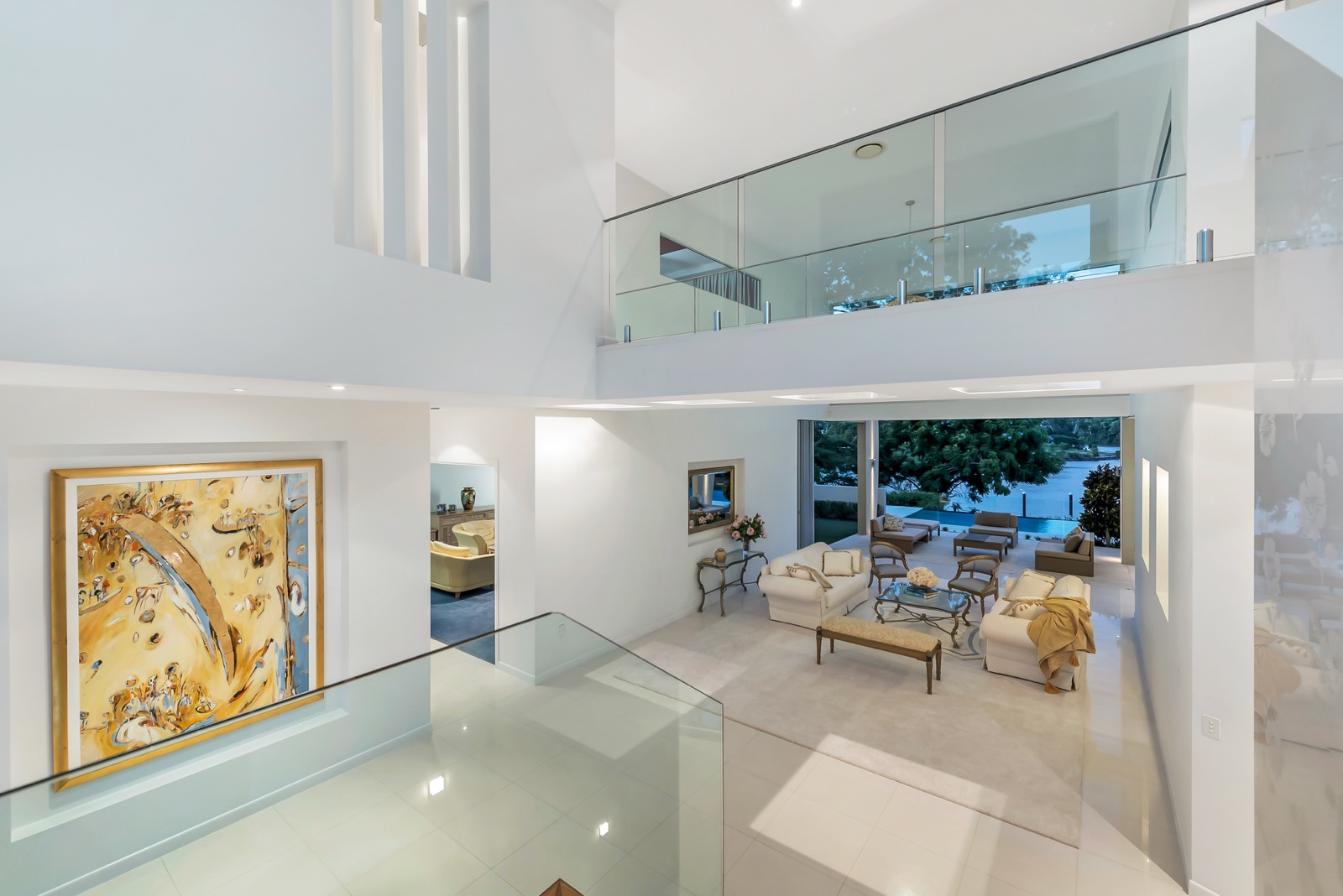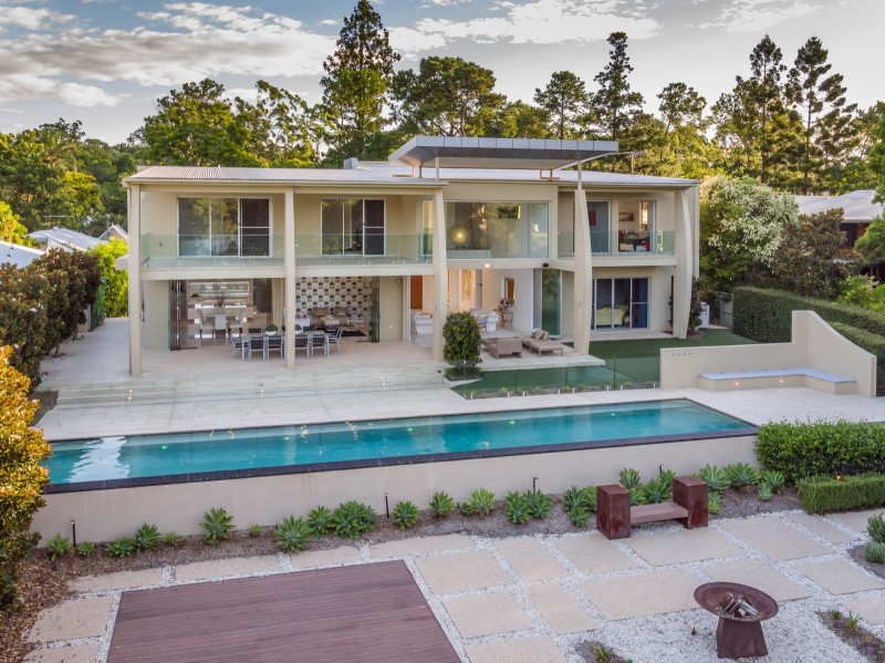 Another large bedroom parallel positioned to the master within the eastern wing expands the accommodation options. Across the glass bottom air bridge to the western wing lie the home's remaining bedrooms, all spacious with generous robes and wide patios, and all again positioned to optimise the northerly river views and breezes. Heading in the opposite direction down from the entry level is the home's artful wine cellar, multiple storage spaces and four car garaging equipped with Tesla charging facilities.