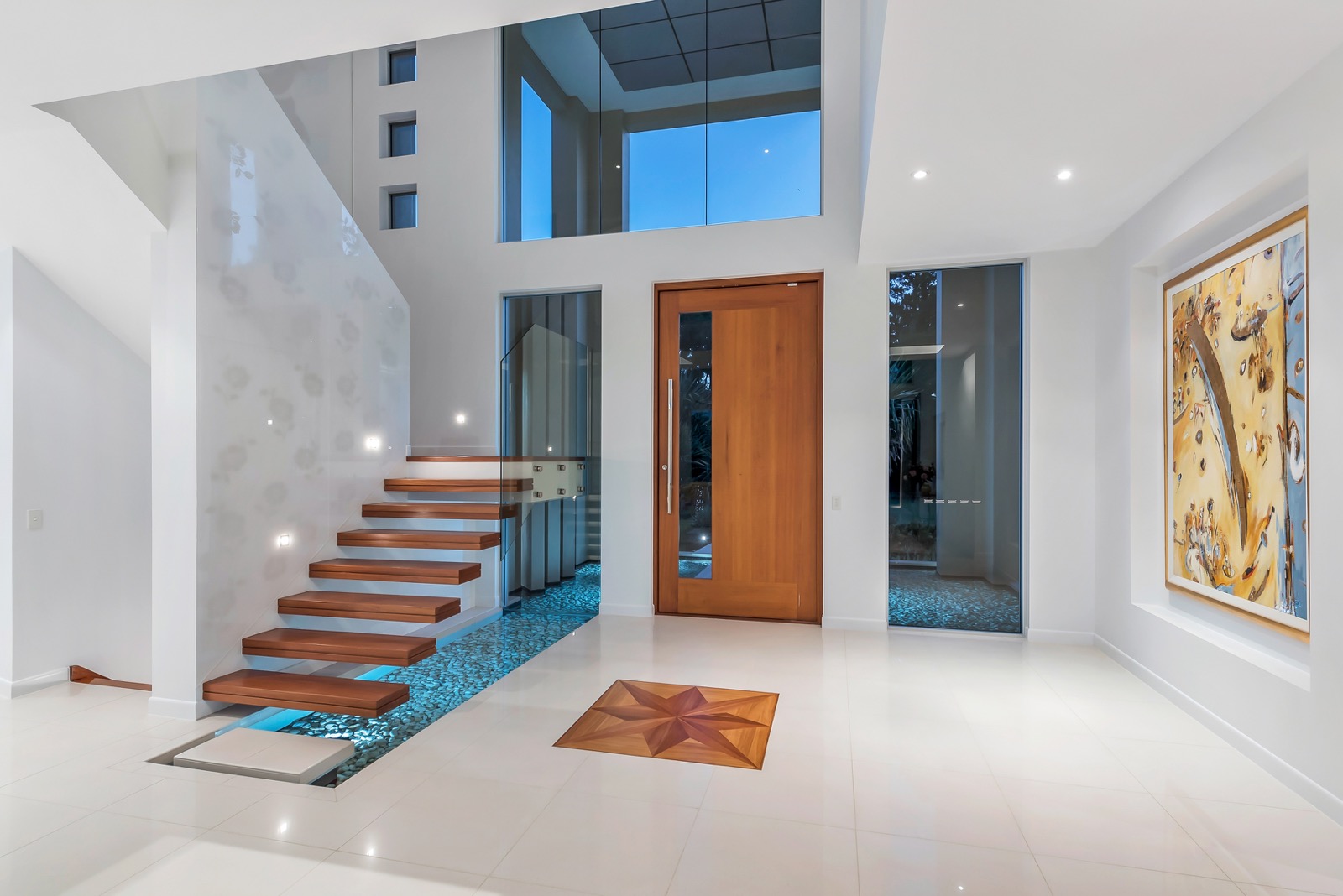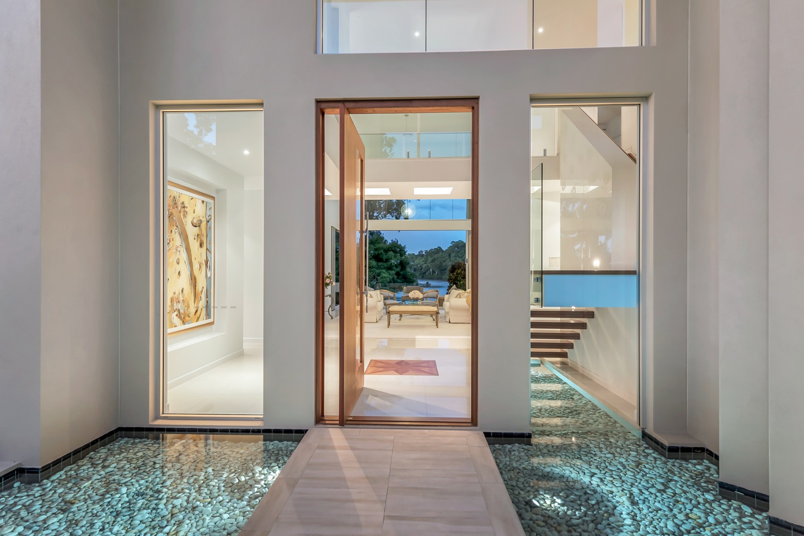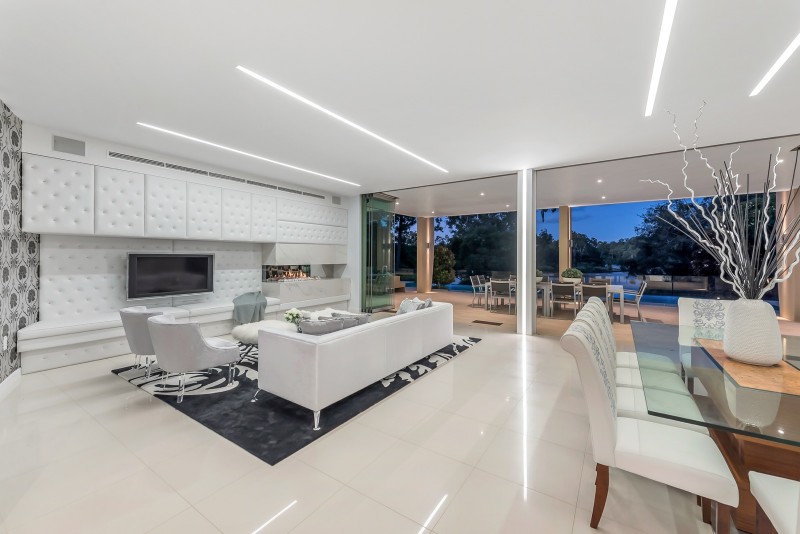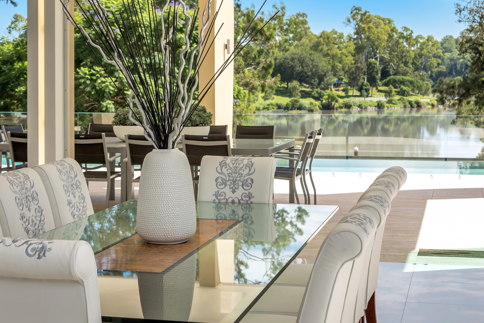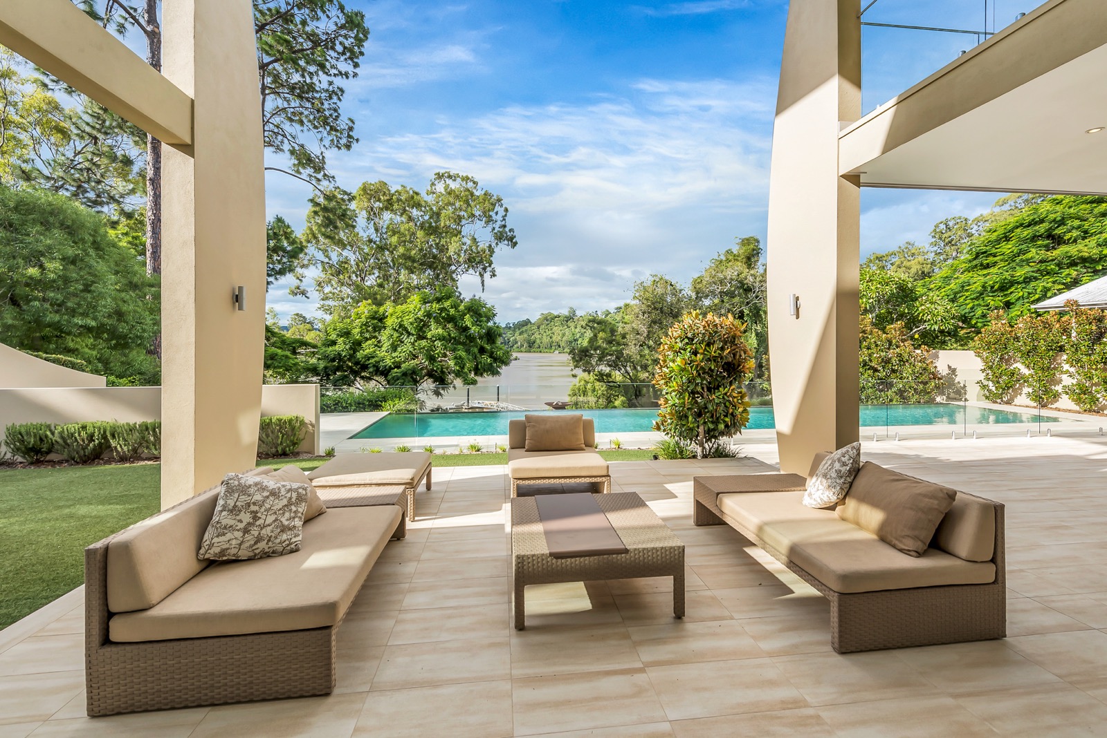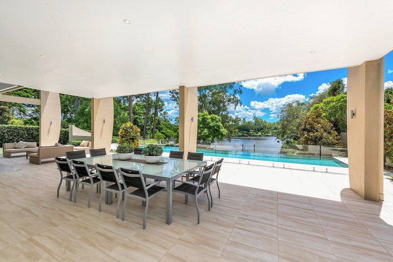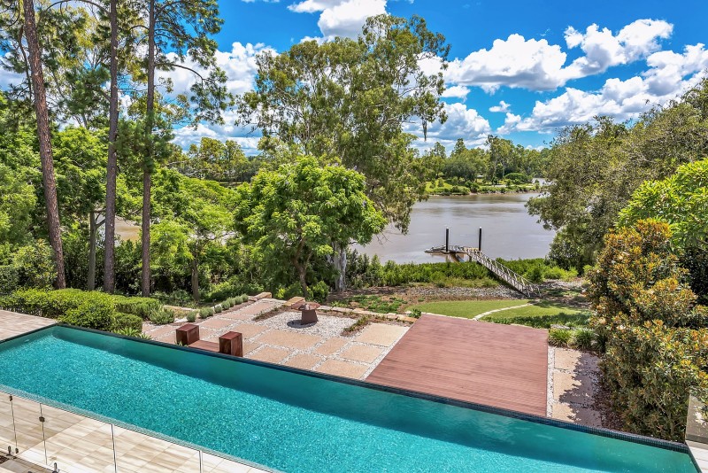 The ground level living areas flow seamlessly out to all weather covered patios and resort-style pool area that includes an amazing 18 metre infinity pool. A separate outdoor entertaining deck, seating area and fire-pit remain open to the stars. Like the home itself, all of the entertainment areas are positioned to take in the long uninterrupted northern trajectory of the river. The slow descent down fully landscaped grounds to the river and its pontoon facilities is always a rewarding sensory treat.