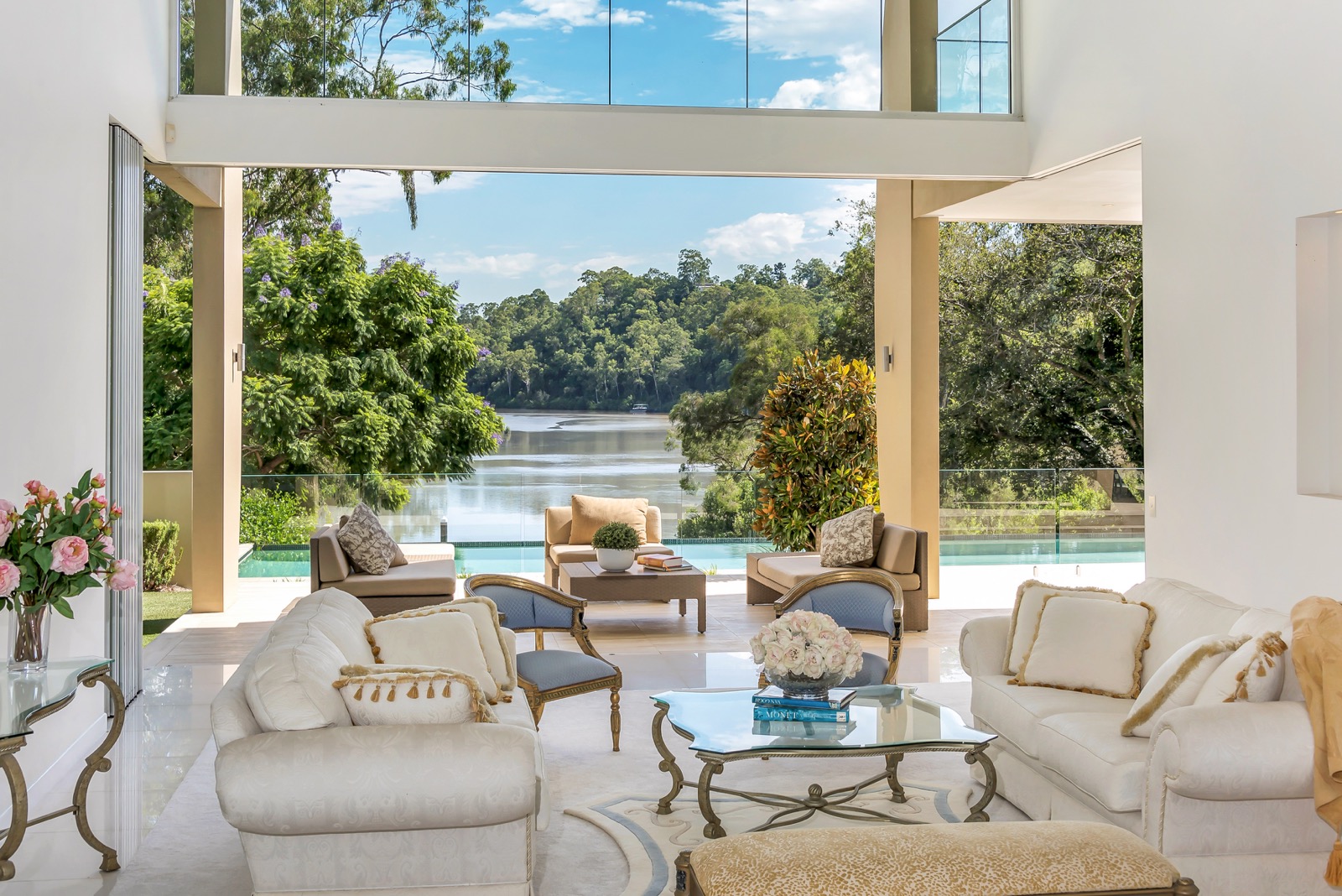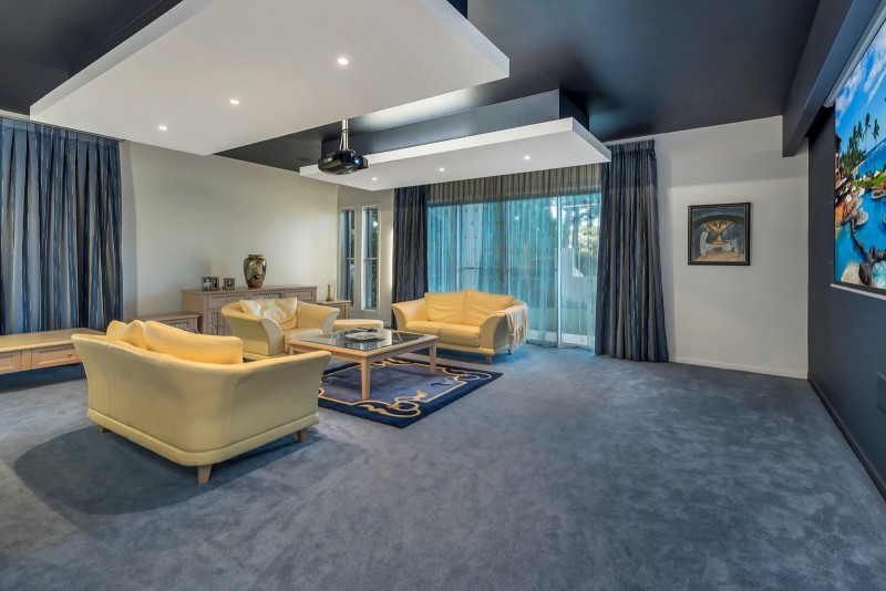 This substantial living area is serviced by a full bathroom and a powder room both of which feature Italian Bisazza tiles from floor to ceiling. A state of the art theatre room left of the living areas takes family movie nights to another level. Also here may be found the guest or fifth bedroom and bathroom facilities. Taking pride of place upstairs is the indulgent master suite with its generous dressing room space, opulent ensuite inclusive of an island bath, chandelier, double shower, and double vanity, and huge river balcony ideal for peaceful relaxation while soaking up the amazing river outlook.