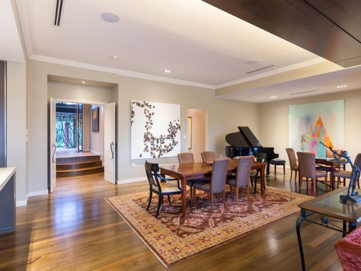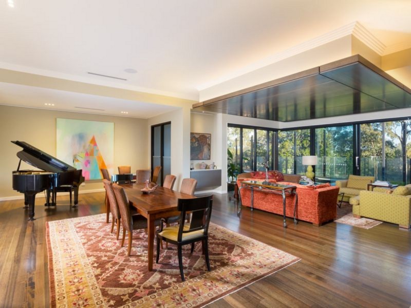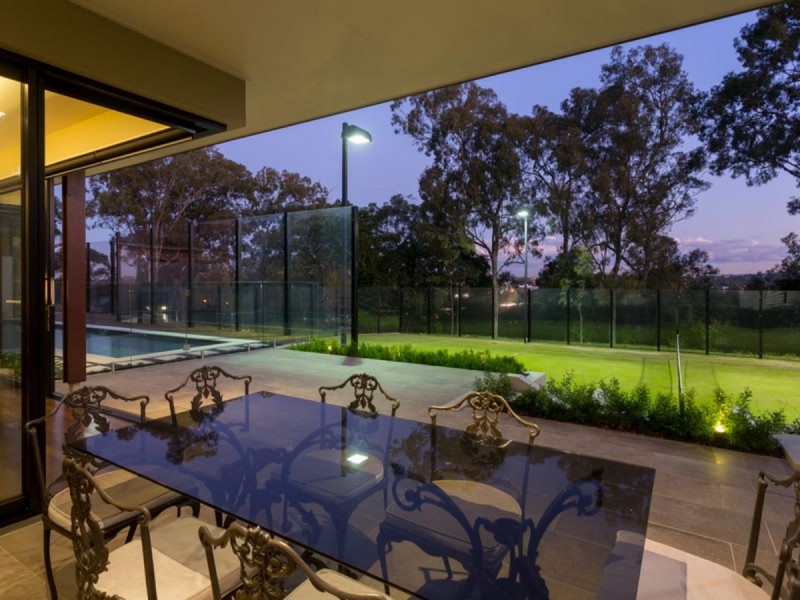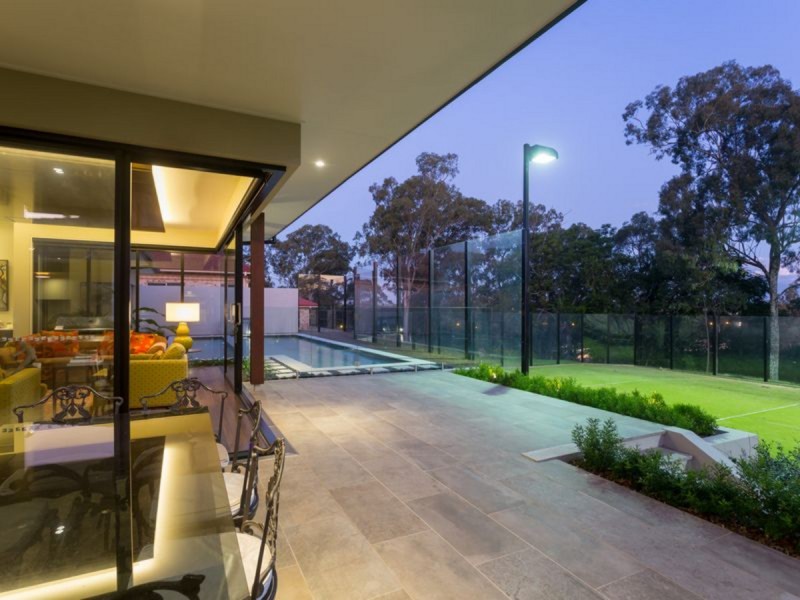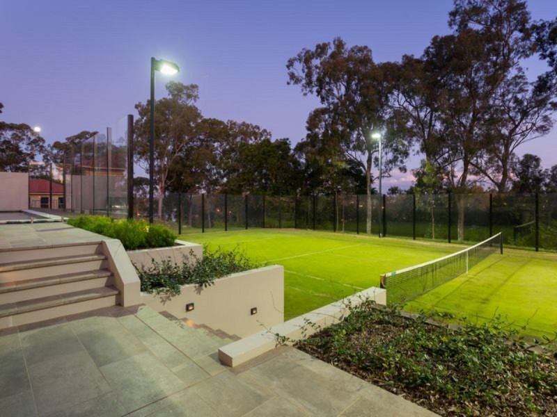 A newly completed renovation undertaken on the grandest of scales has transformed this riverfront estate, creating a sleek and sophisticated abode with a pool and tennis court amidst the private and elevated grounds. A colonnaded walkway across pools of running water provides a fitting introduction to the home, as does the custom wrought-iron gate. Inside, a formal foyer transitions seamlessly into the main living area, continuing the impressive, yet immediately welcoming feel. It is here that the scope and detail of the transformation is fully revealed, with a range of custom finishes all on hand to elevate the space to one of exclusive refinement. Amidst the high ceilings and banks of glass, these include immaculate floors of Tasmanian Oak, Integrated cabinetry topped with rare marble and backlit timber ceiling panels which have been used to delineate and define separate areas to great effect.