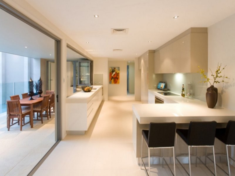 The heated swimming pool is yet another example of this, with the home surrounding and enveloping the water on three sides, giving most rooms water views while also creating a tranquil focus for the entire property. Furthermore, the walls surrounding the pool predominantly consist of bi-folding glass doors that can be pushed right back, essentially creating one seamless indoor/outdoor space. This is also the case with the gourmet kitchen, which runs parallel along the entire length of the pool. Thanks to a set of bi-folding windows along the island bench, it too can become part of this vast space, with the bench cleverly doubling as a bar when entertaining. The kitchen is very much in keeping with the rest of the home, boasting pristine, soft-close cabinetry, stone benches, stainless steel Kleenmaid appliances and an integrated dishwasher to maintain the sleek lines.