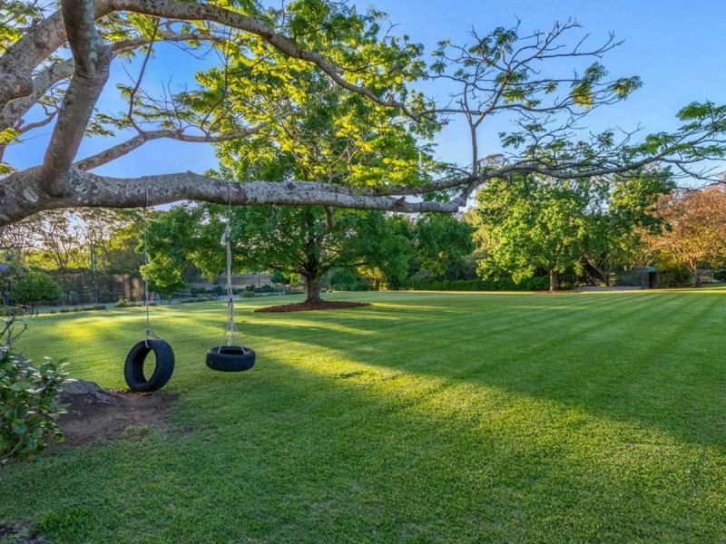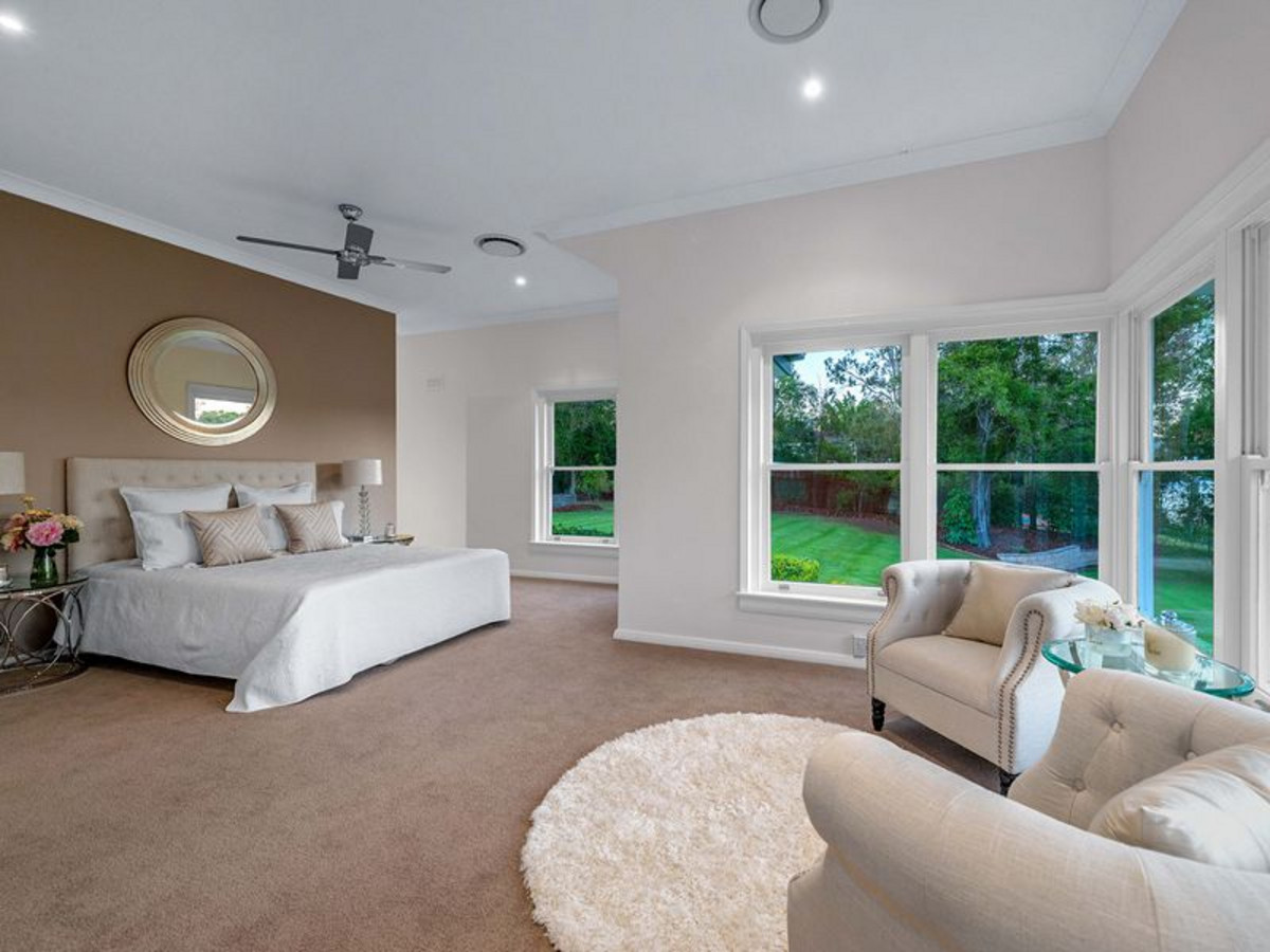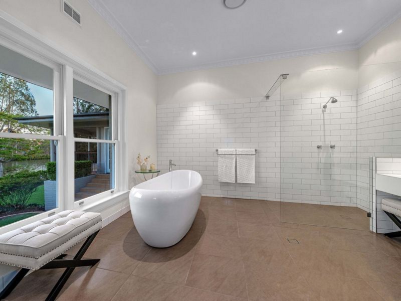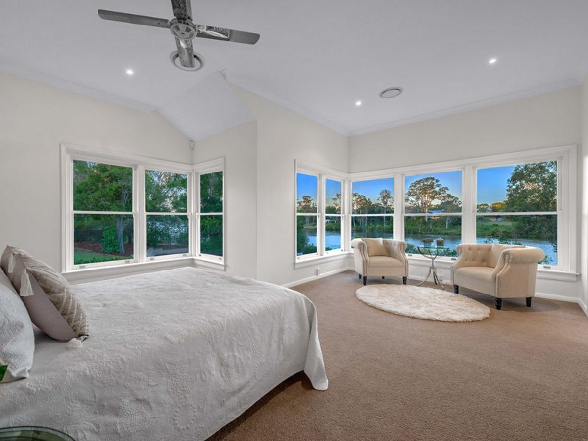 The master bedroom with its river views and timber sash windows is an absolute delight. It includes a generous walk-in wardrobe and luxurious ensuite with island bath, subway tiles and designer tapware. Set upon a massive level allotment measuring 9561m2 with 67 metres of river frontage and a N/E aspect, this superb residence features a stunning pool area down by the river, a 10m x 3m pontoon, a timber childrens playground and fort as well as a floodlit championship tennis court.