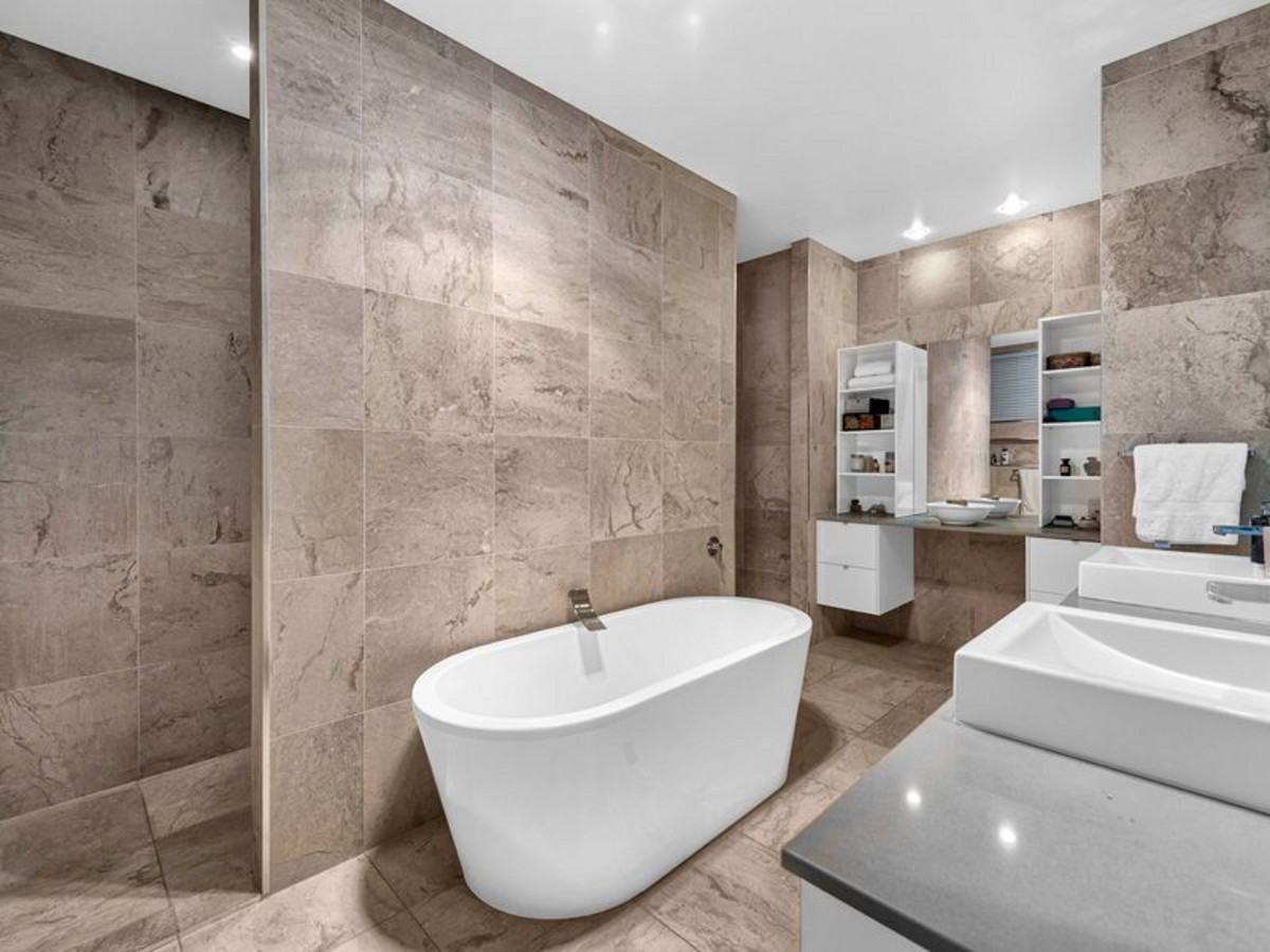 The master suite is a luxurious retreat of epic proportions with its impressive double height ceilings and dressing room. Its stylish, tranquil ensuite features floor to ceiling tiles, island bath, twin vanities and a luxurious built-in dressing table that combine to create the atmosphere of a deluxe day spa.