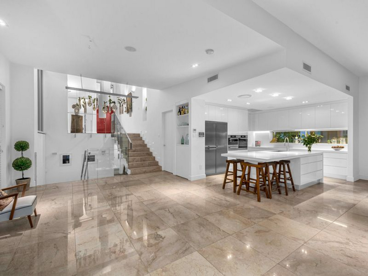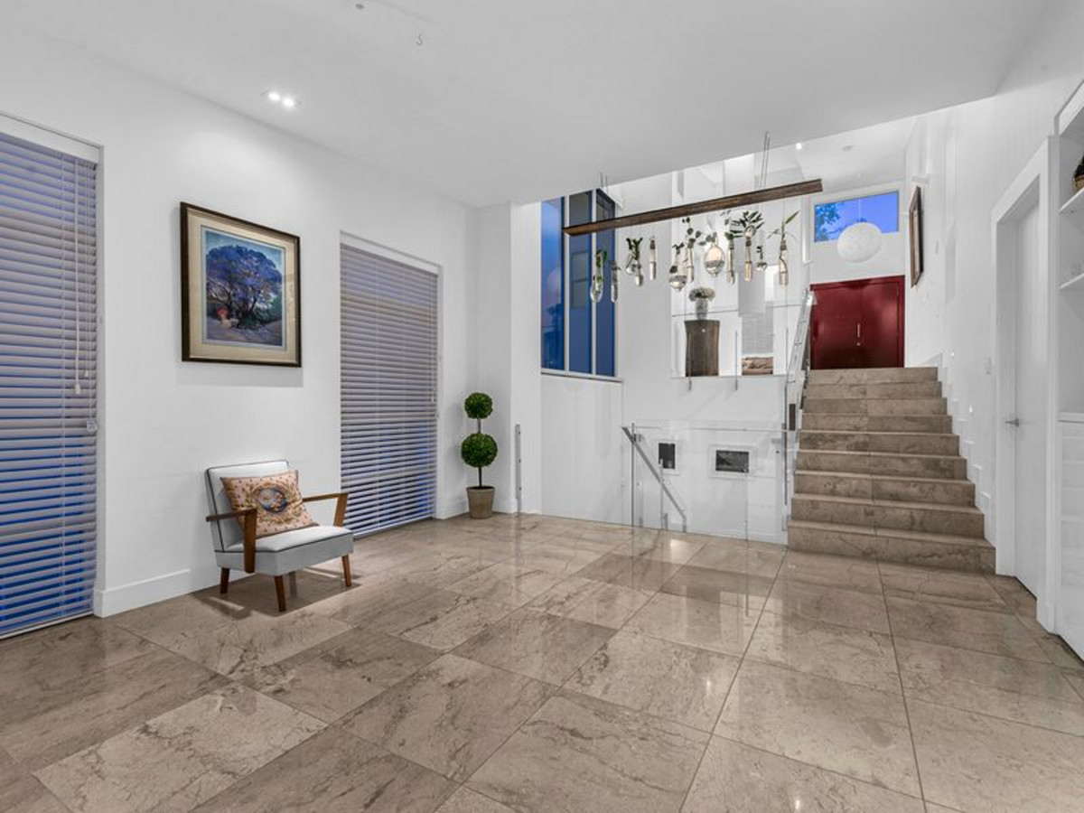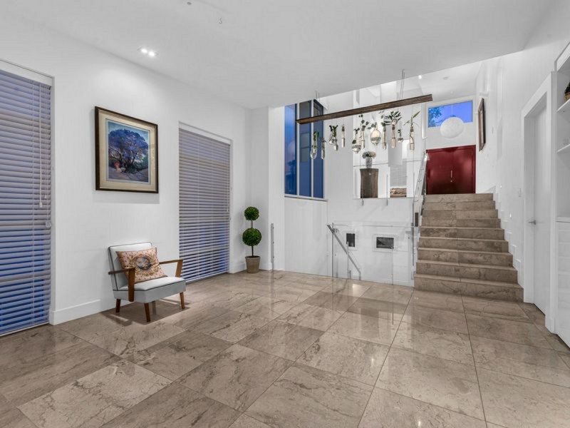 The home's immense floorplan is spread across 550m2 with the main living areas enjoying all the benefits of an open plan design. Marble floors contribute to the elegance of the home, where the dining room, family room and formal lounge with Escea gas fireplace interact seamlessly with the kitchen and flow onto a large entertaining balcony with breathtaking views of the urban landscape and uninterrupted skyline. The state-of-the-art designer kitchen is both beautiful in appearance and functional in form. It features Caesarstone benchtops, Miele appliances, island bench, glossy white two pack cabinetry, an abundance of bench space and storage drawers and cupboards along with a spacious butler's pantry.