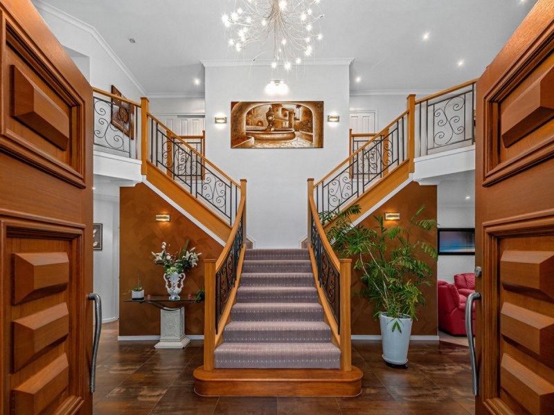 Enter the home through double timber doors into the vast foyer with its soaring double height ceilings and magnificent imperial staircase. From here, the home's generous floorplan allows plenty of room for family members to move offering both open plan living areas that bring the family together and multiple private rooms that provide separation when needed. In the hub of the home, the modern family kitchen offers Caesarstone benchtops, five-burner gas cooktop, chef's oven, built-in appliances, coffee machine, walk-in-pantry and island bench. The kitchen connects to the open plan dining room, lounge room, rumpus room and beautifully crafted full-size built-in timber bar complete with under bench fridges and wine racks. Take family movie nights to the next level in the nearby purpose built media room where a projector screen, surround sound and acoustic treatment in the walls creates a cinematic experience without disturbing other members of the household.