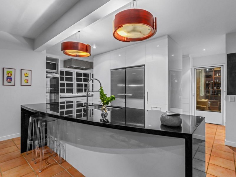 Arrive at the secure front gate before meandering down the long driveway to this picture-perfect home on the river's edge. Walk through the front door into the grand entry where double-height ceilings open up the home providing glimpses of the many rooms to be discovered. On the ground level, the modern designer kitchen features a striking black Caesarstone island bench with breakfast bar and luxe tapware surrounded by gloss white cabinets, chef's canopy rangehood and butler's pantry with second fridge. It also features top of the line V-Zug appliances including induction cooktop, induction wok, oven, steam oven and warming drawer, along with a Zip hot/cold water system. An adjoining refrigerated wine cellar with its aesthetically pleasing diamond cube wine racks can also be viewed through a large glass window from the nearby library.