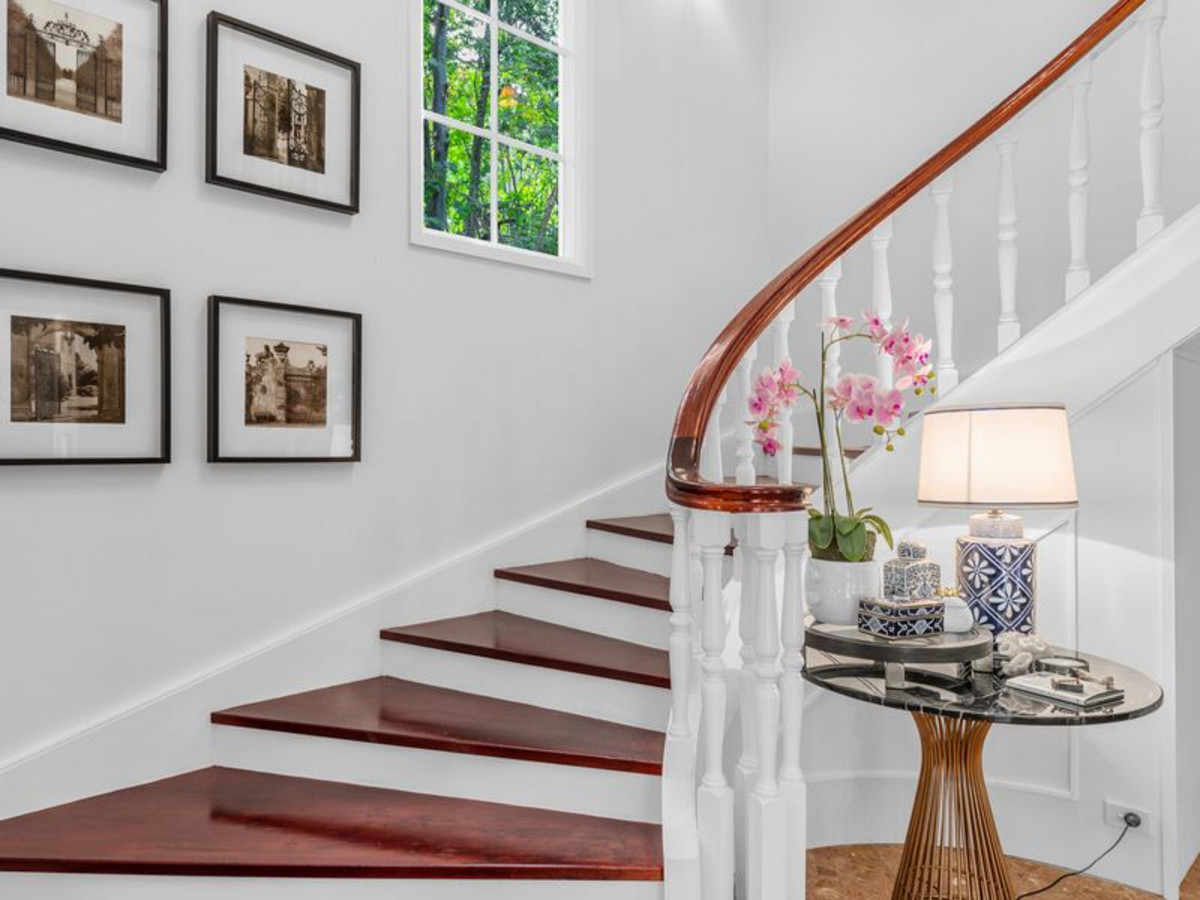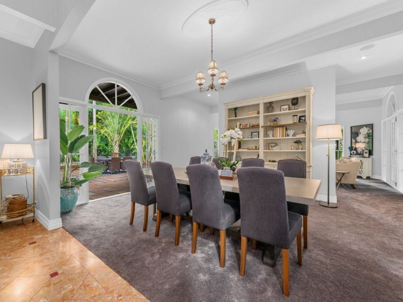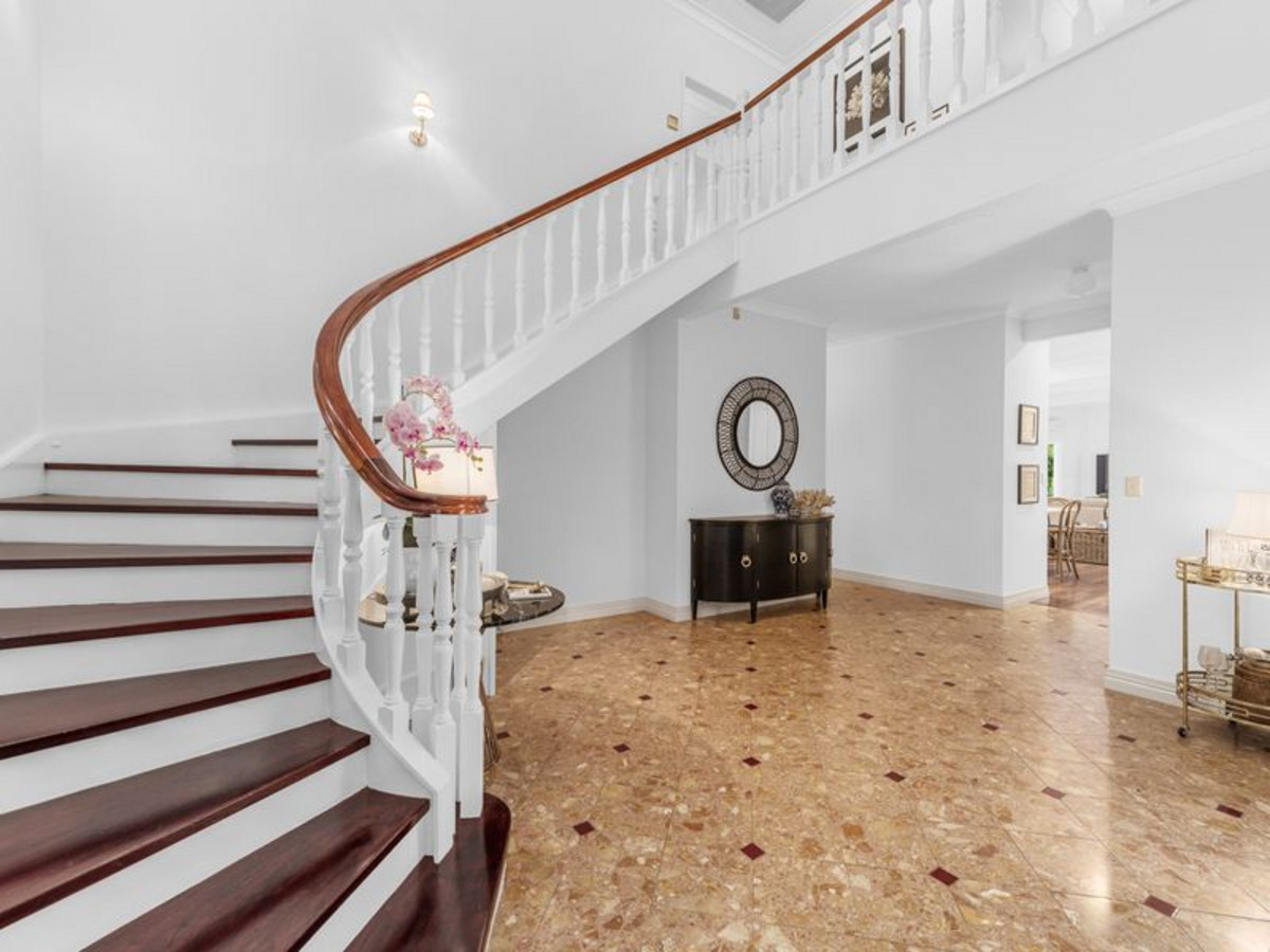 Enter this immaculately maintained property bordered by a lush nature reserve through the impressive double-gated entry with sandstone walls and make your way towards the circular driveway. With the home freshly painted both inside and out, it will feel like you're moving into a brand new residence to begin your next chapter. Step inside the double front doors into the formal foyer where marble floors, a magnificent curved staircase and overhead void create a marvellous sense of opulence and grandeur. A combination of timber floorboards and brand new carpets throughout along with arched French doors, decorative cornices and wide wrap-around verandahs help to create the charming and homely atmosphere of this sophisticated residence.