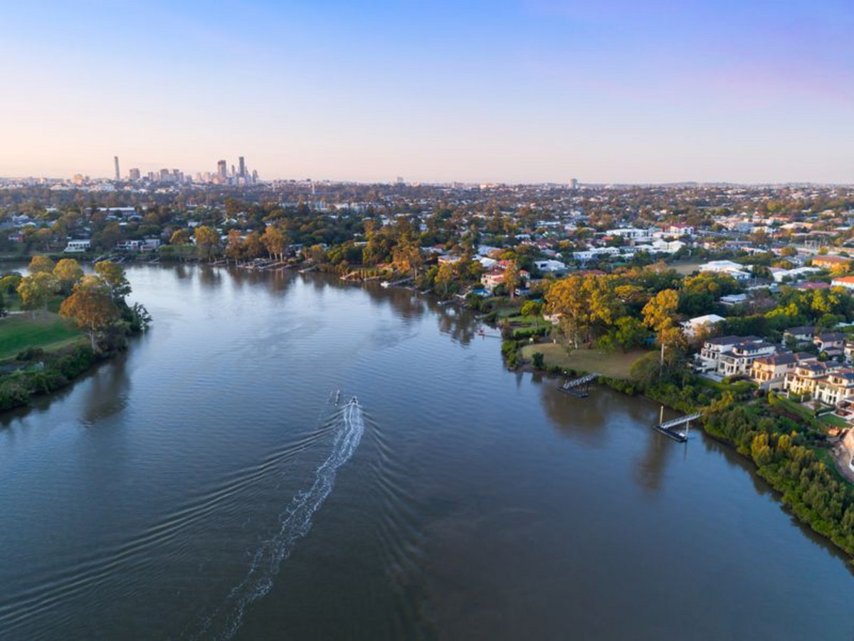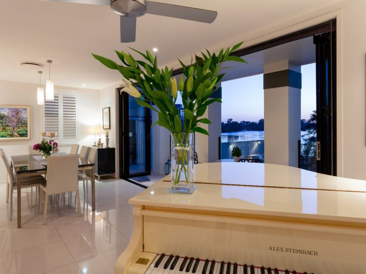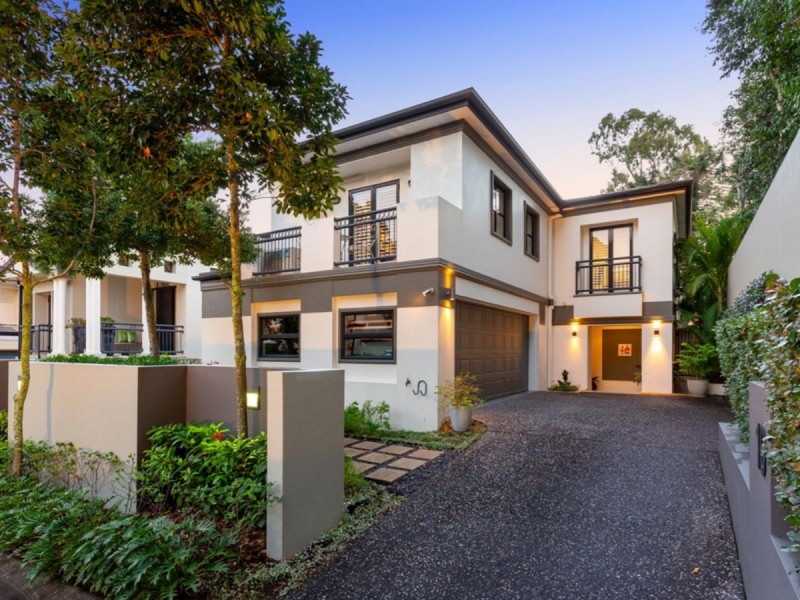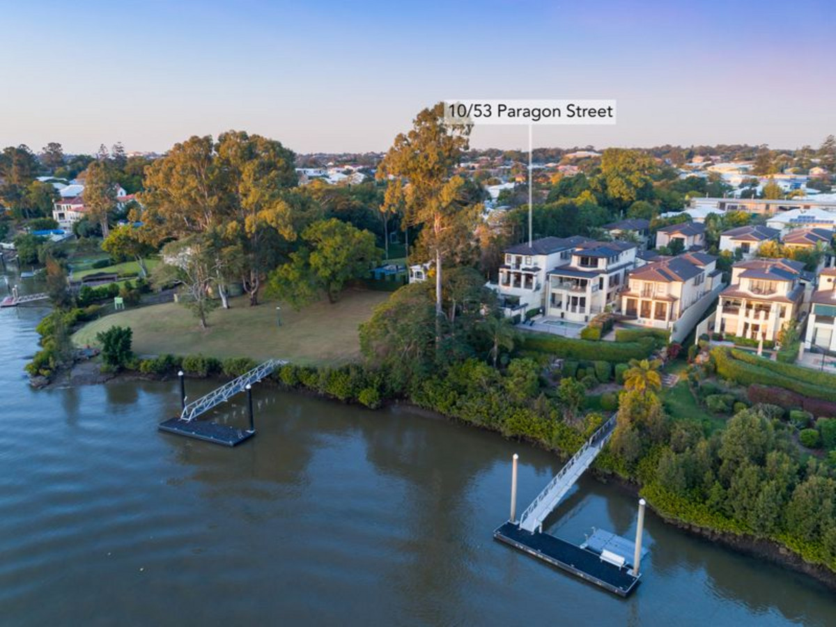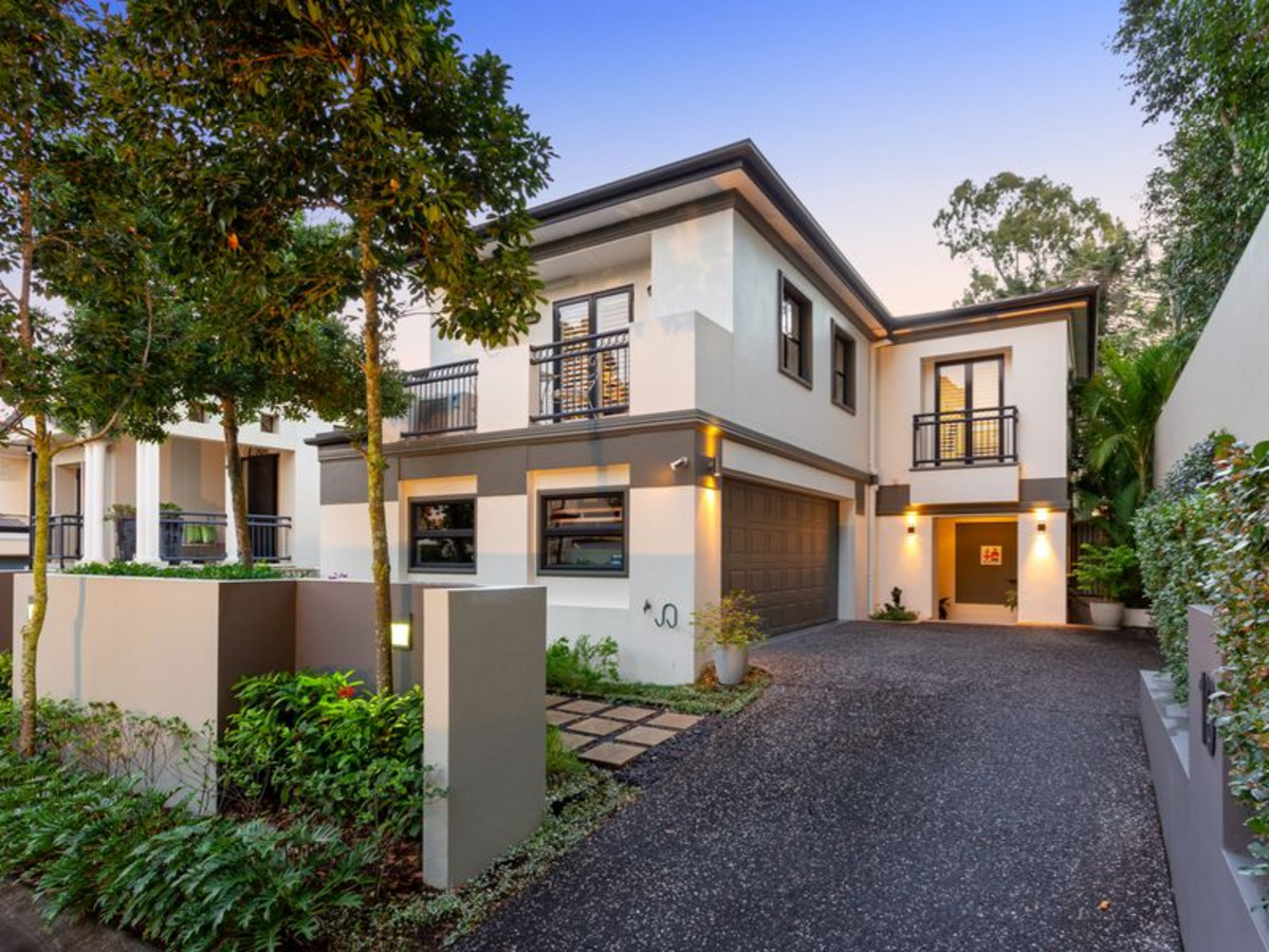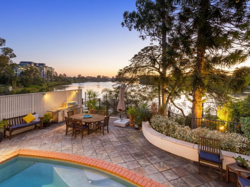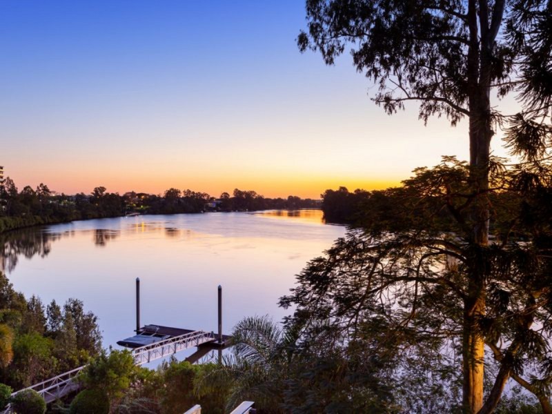 Ideal for the modern family, this wonderful two-storey home enjoys stunning views of the Brisbane River across to Indooroopilly Golf Course, cooling river breezes, beautifully landscaped gardens, an inviting pool and outdoor entertaining area, a floor plan that flows and modern finishes throughout. Private and extremely quiet, this magnificent home is the best in the complex offering the largest and widest block, the quietest position at the furthest point from the street, large overhanging shade trees and private and direct access to the pontoon through the garden.