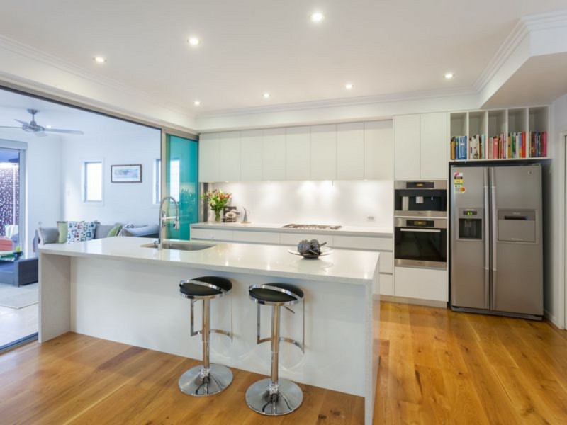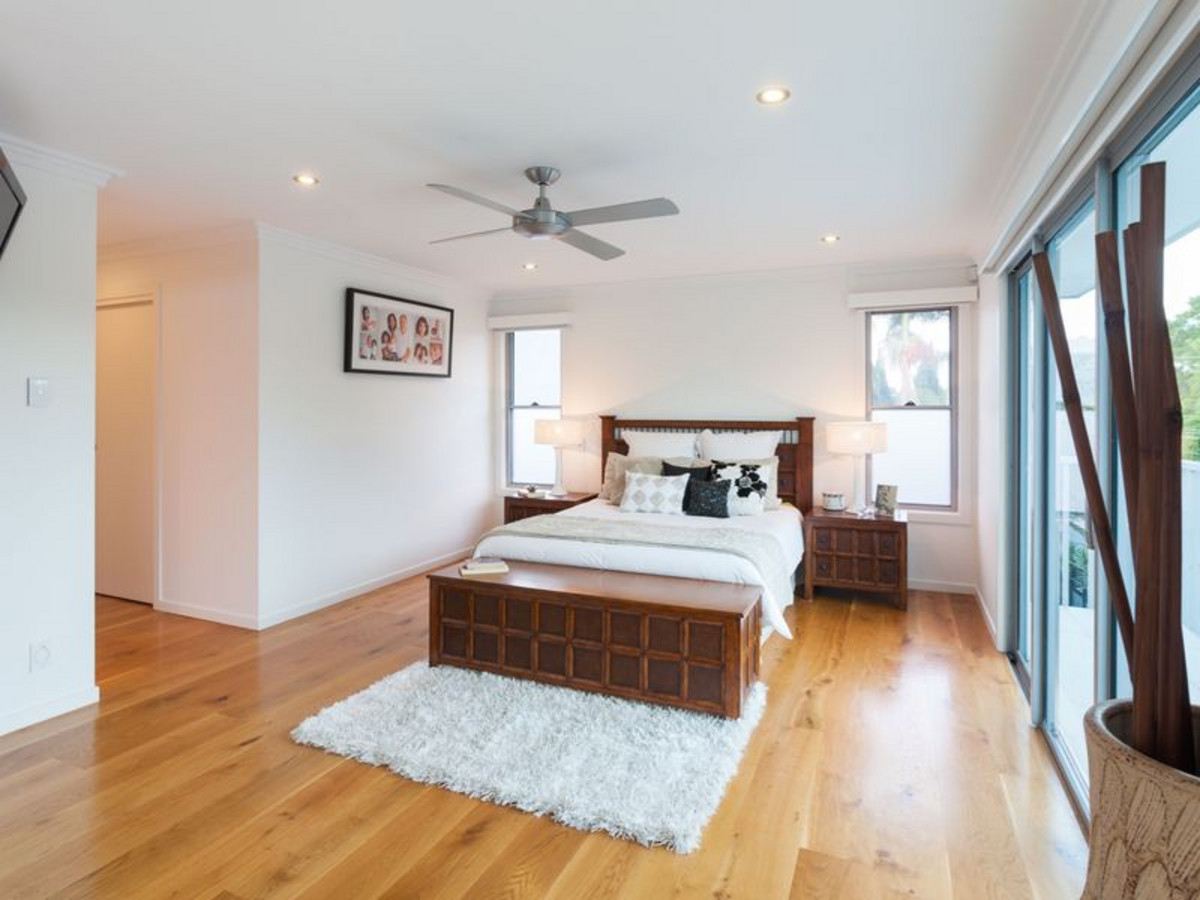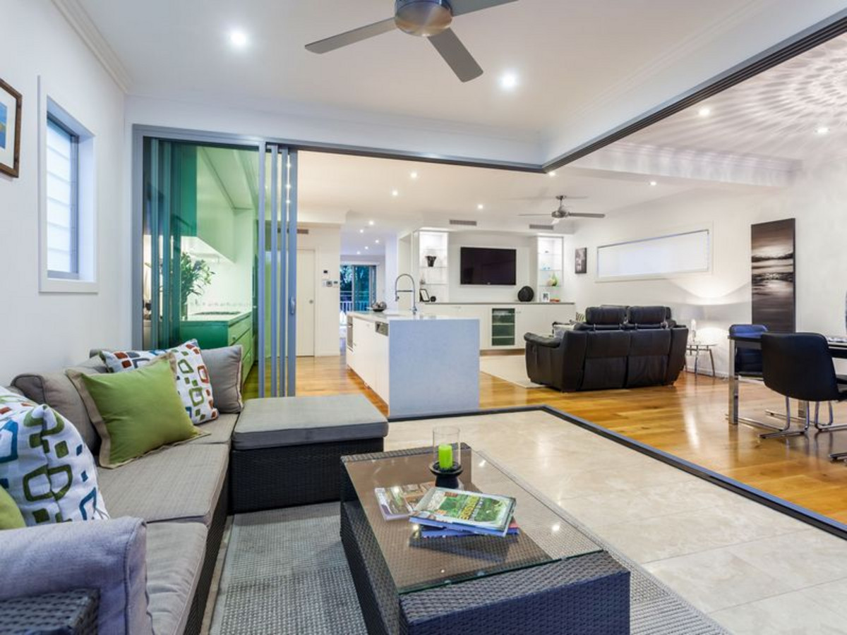 Inside, the formal lounge forms a fitting introduction to the home with the balcony and bi-folding doors able to easily usher in river views and cooling breezes, while the eco fireplace and electronically controlled blinds make it just as effortless to ramp up warmth and privacy. Largely open plan in design, this whole level enjoys a natural flow directly from the entry to the rear alfresco living zone which really enforces the connection to the water throughout. Finishes and fixtures have also been carefully considered, with a restrained palette allowing a select group of bespoke materials to shine. These include honed and filled travertine and Calcutta oro marble in the bathrooms, detailed cornicing and just a touch of luxe with embellished lighting. The star of the show however is the 200-year-old recycled oak flooring salvaged from an old flour mill in the Laussane Valley, France. The wonderfully wide boards have been used throughout the home and bring a bespoke edge to the build.