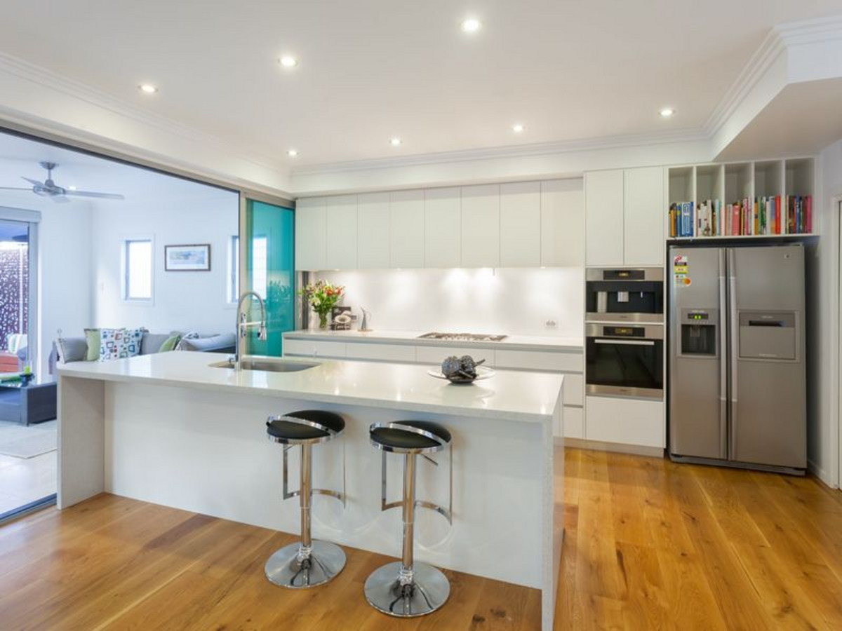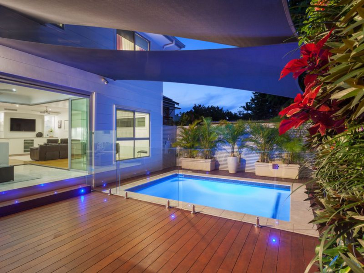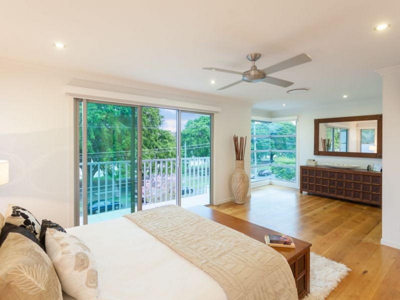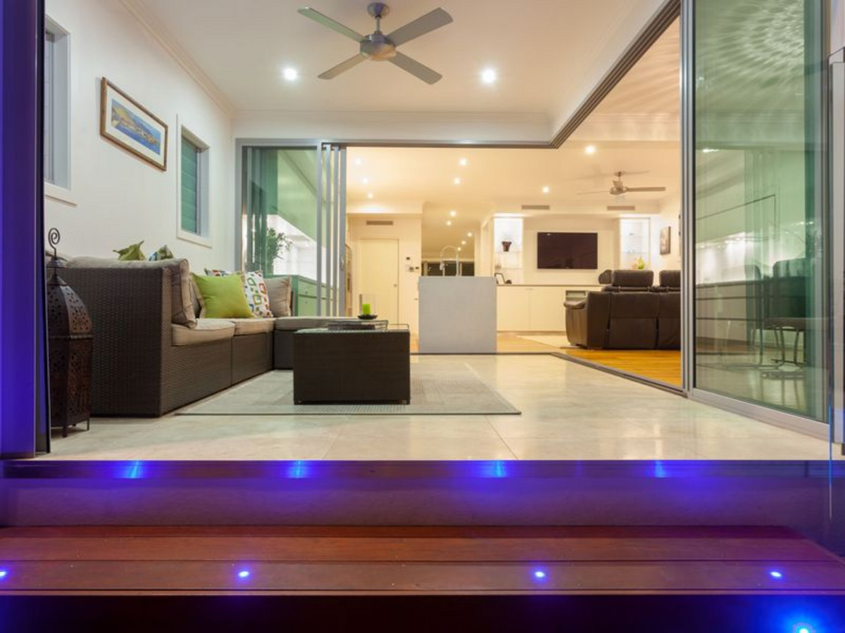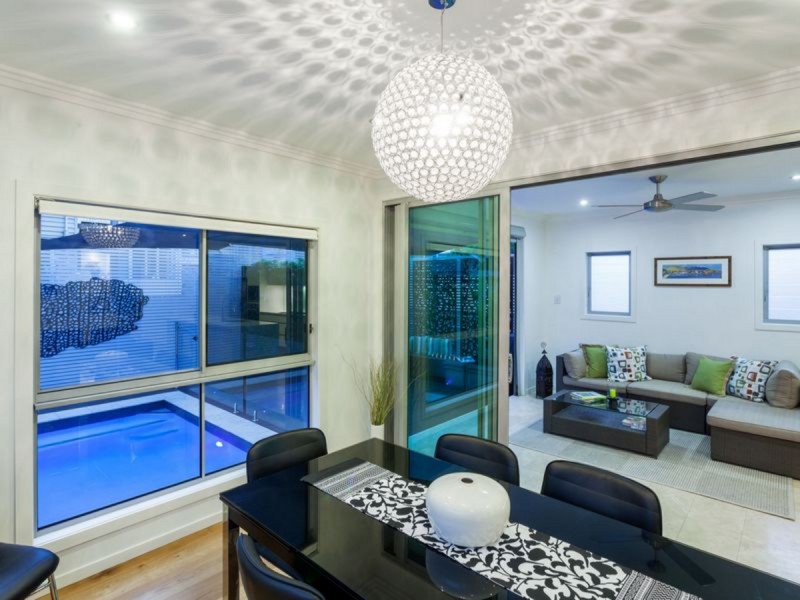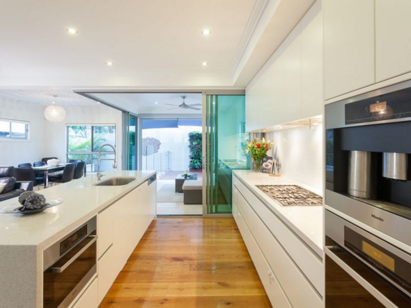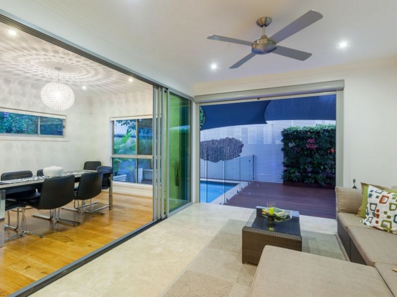 Like the rest of the house, the kitchen showcases elegance through sleek, refined finishes with the neutral Caesarstone bench tops and glass splash backs able to remain minimalist and uncluttered thanks to a generous walk-in pantry and soft-closing cabinetry. A full suite of Miele appliances, (including in-wall espresso machine), perfectly complements the overall design aesthetic. Space for casual living and dining surround the kitchen and are supported by a versatile outdoor room which can be fully incorporated into the home as well as utilised as an outdoor entertainment area. This gives a fantastic, pavilion-style feel and really connects the house with the saltwater pool, the outdoor deck with its vertical garden and Queensland's ambient weather.