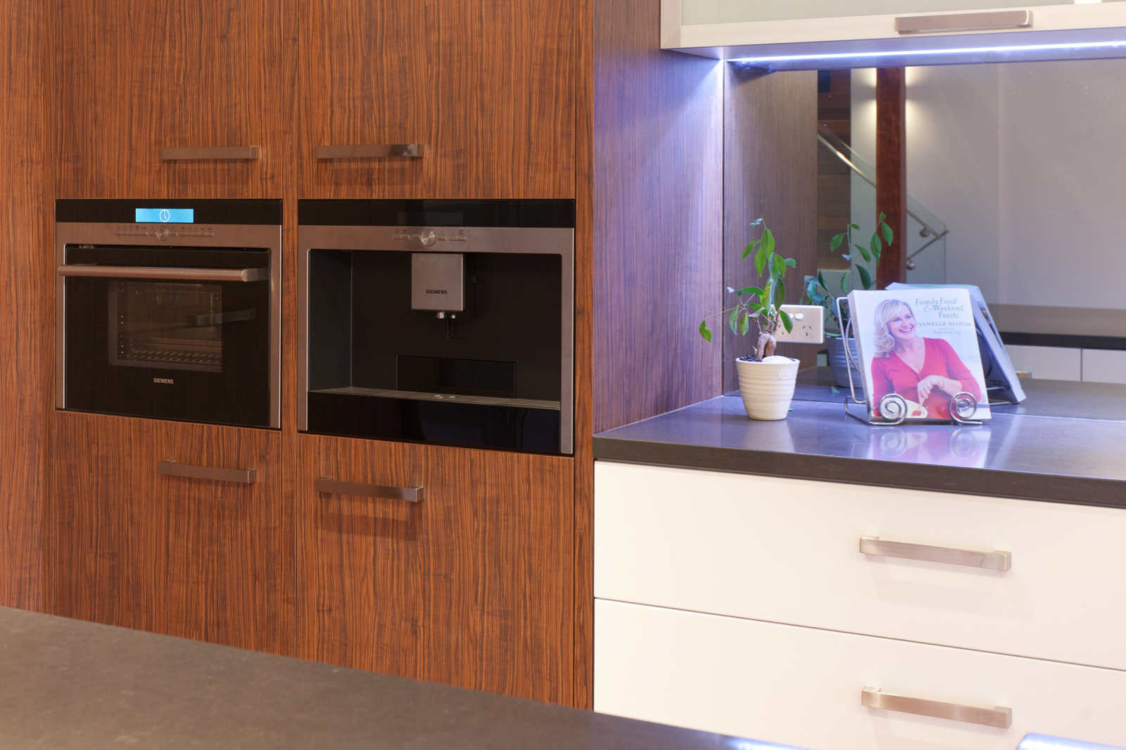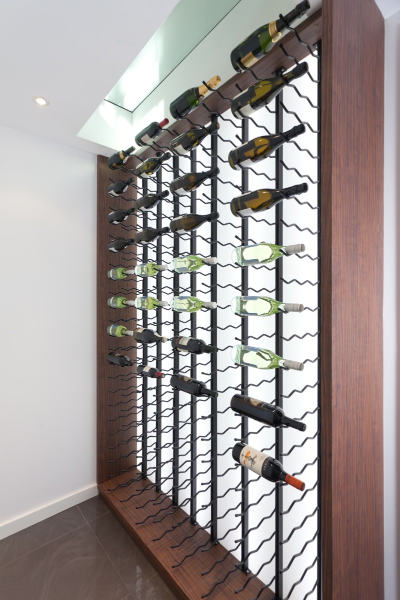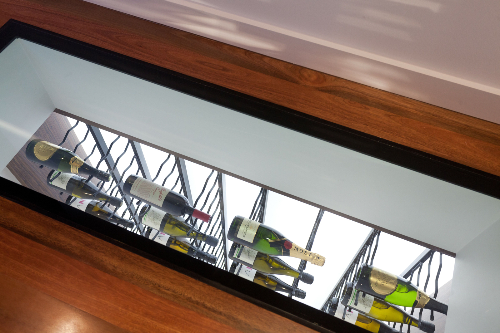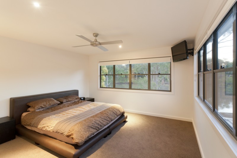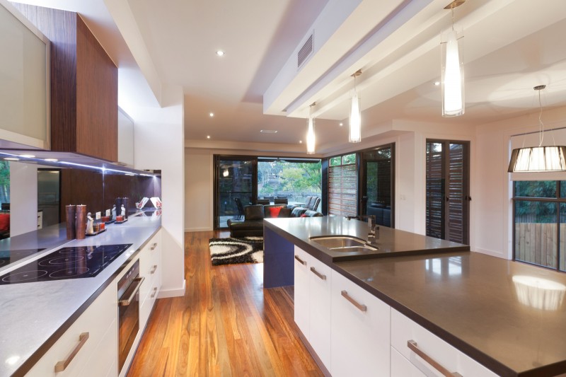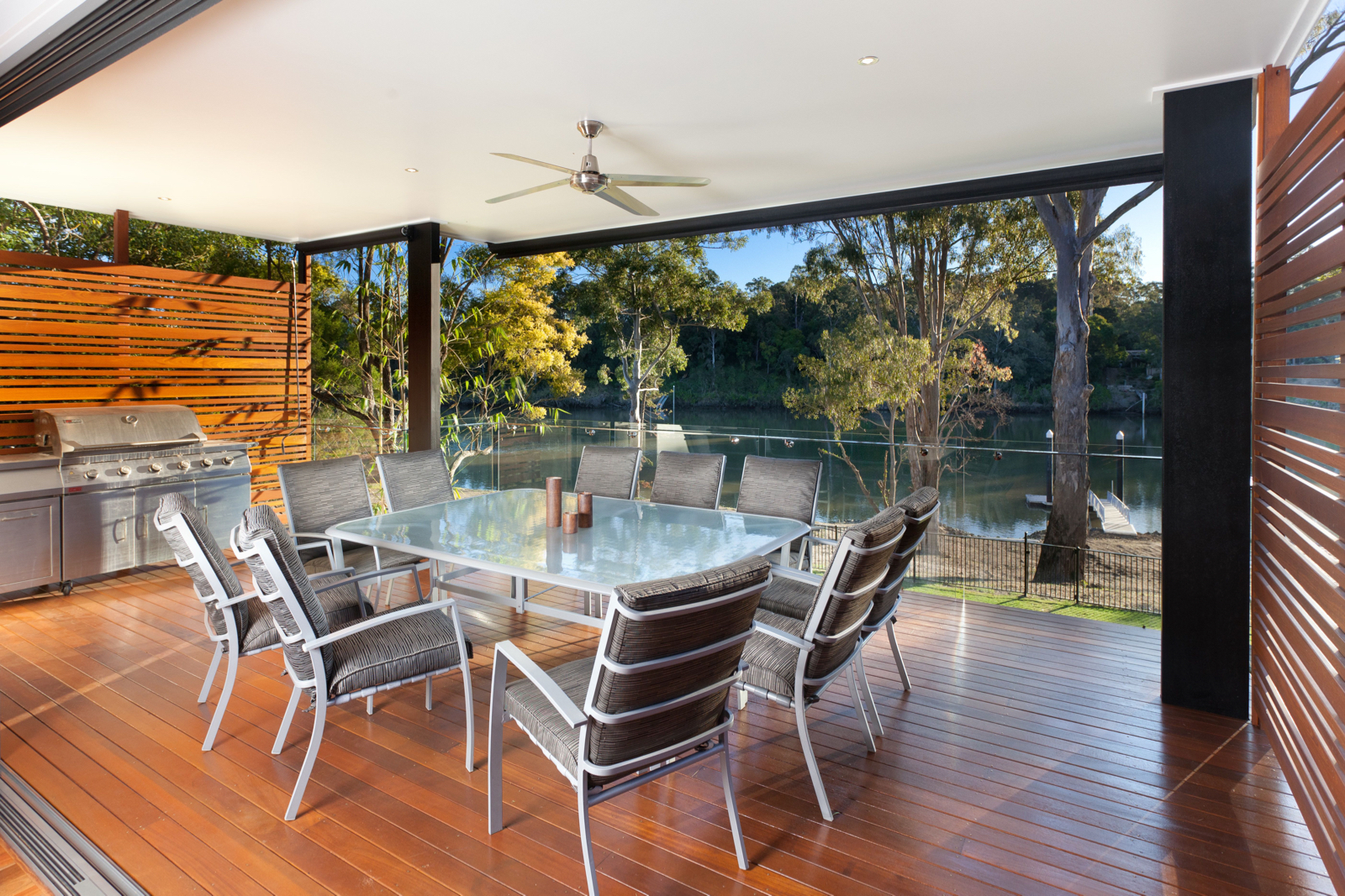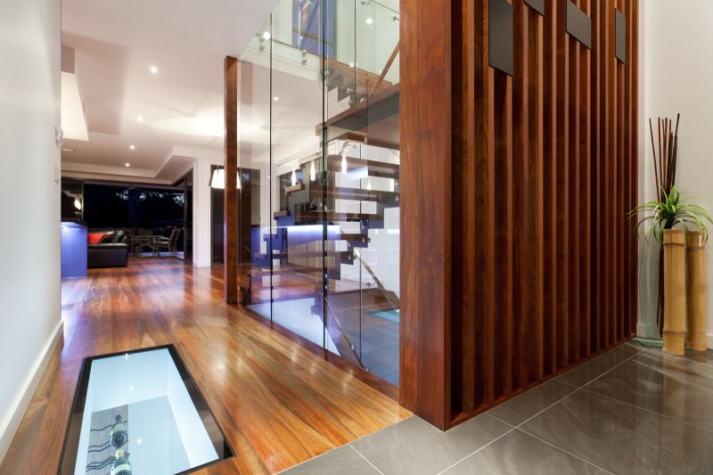 Stepping inside, this metropolitan style is continued, with a striking timber art installation separating the foyer from the main staircase and a glass panel that has been set into the floor allowing visitors to literally walk over countless bottles of wine and champagne in the cellar below. All living, dining and casual entertaining plays out on this central floor, where an open plan design combined with plentiful windows, louvers and banks of sliding glass doors ensure the preservation of not only natural light and breezes, but the wonderful river views. Perfectly complementing its surrounds, the kitchen blends functionality with European designer style to great effect. Expansive charcoal stone bench tops provide a clean, streamlined look which is supported by capacious cabinetry in white and timber veneer. There is a butler's pantry with sink and second dishwasher for effortless entertaining, while stainless steel appliances including in-wall espresso machine complete the gourmet experience.