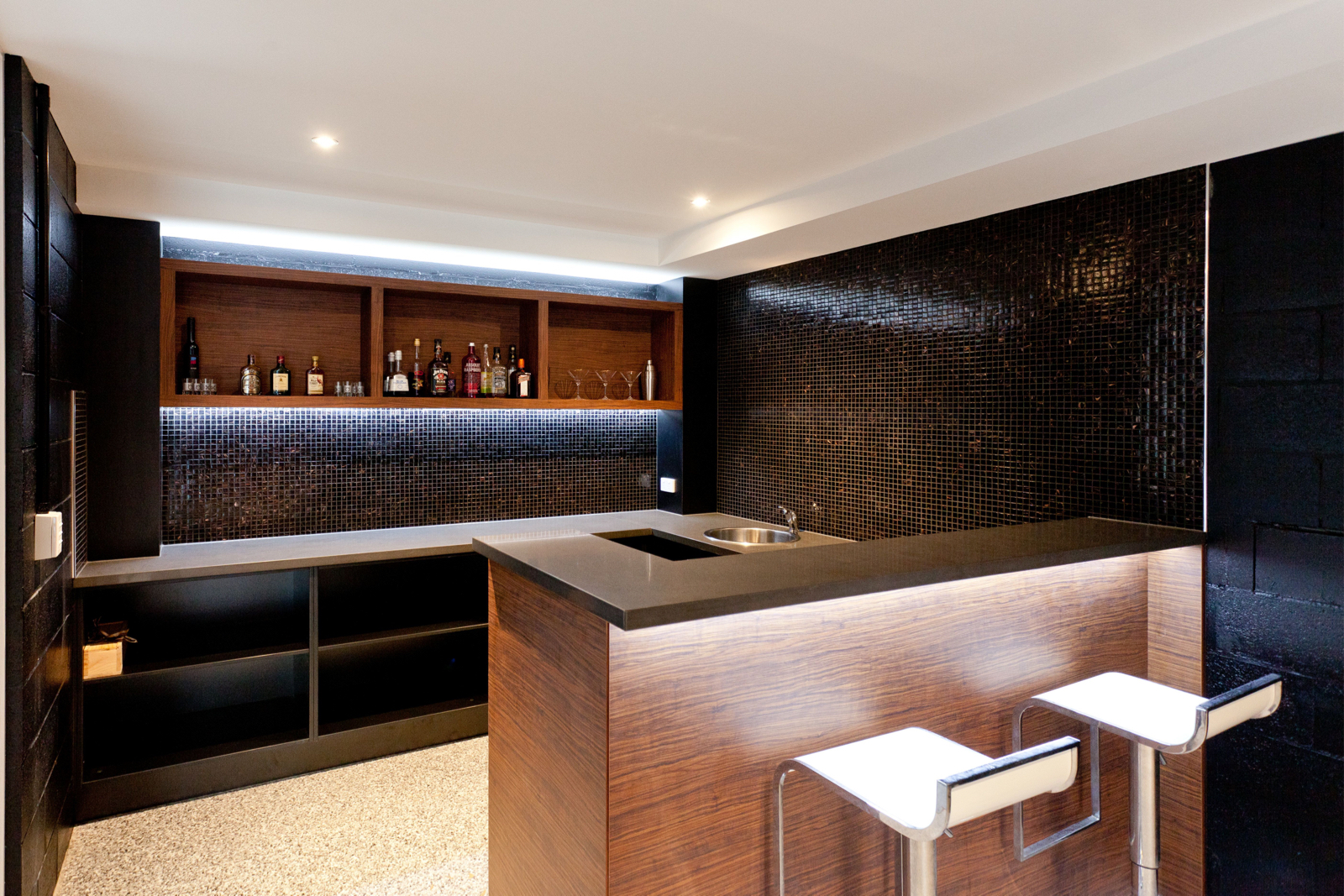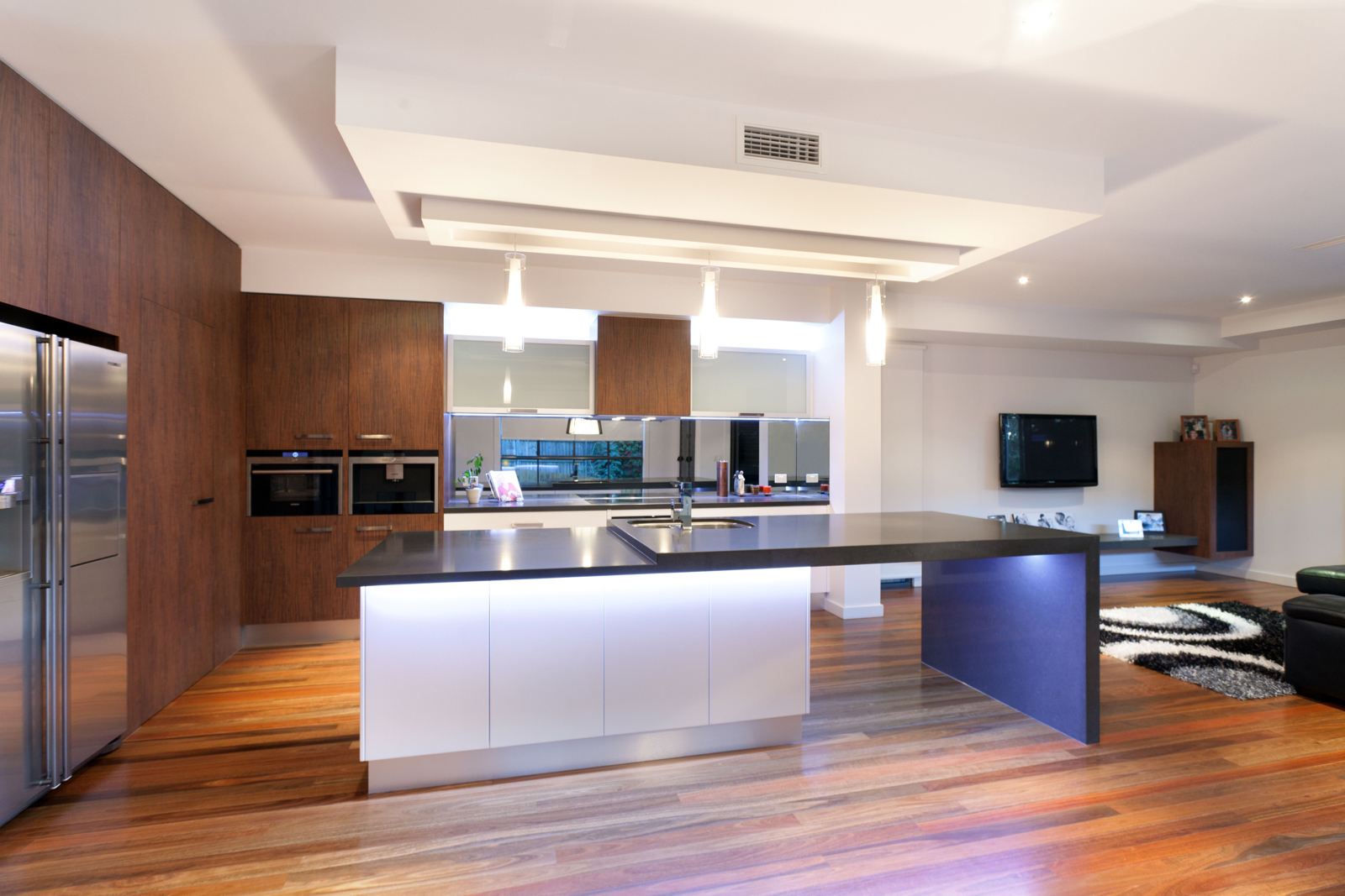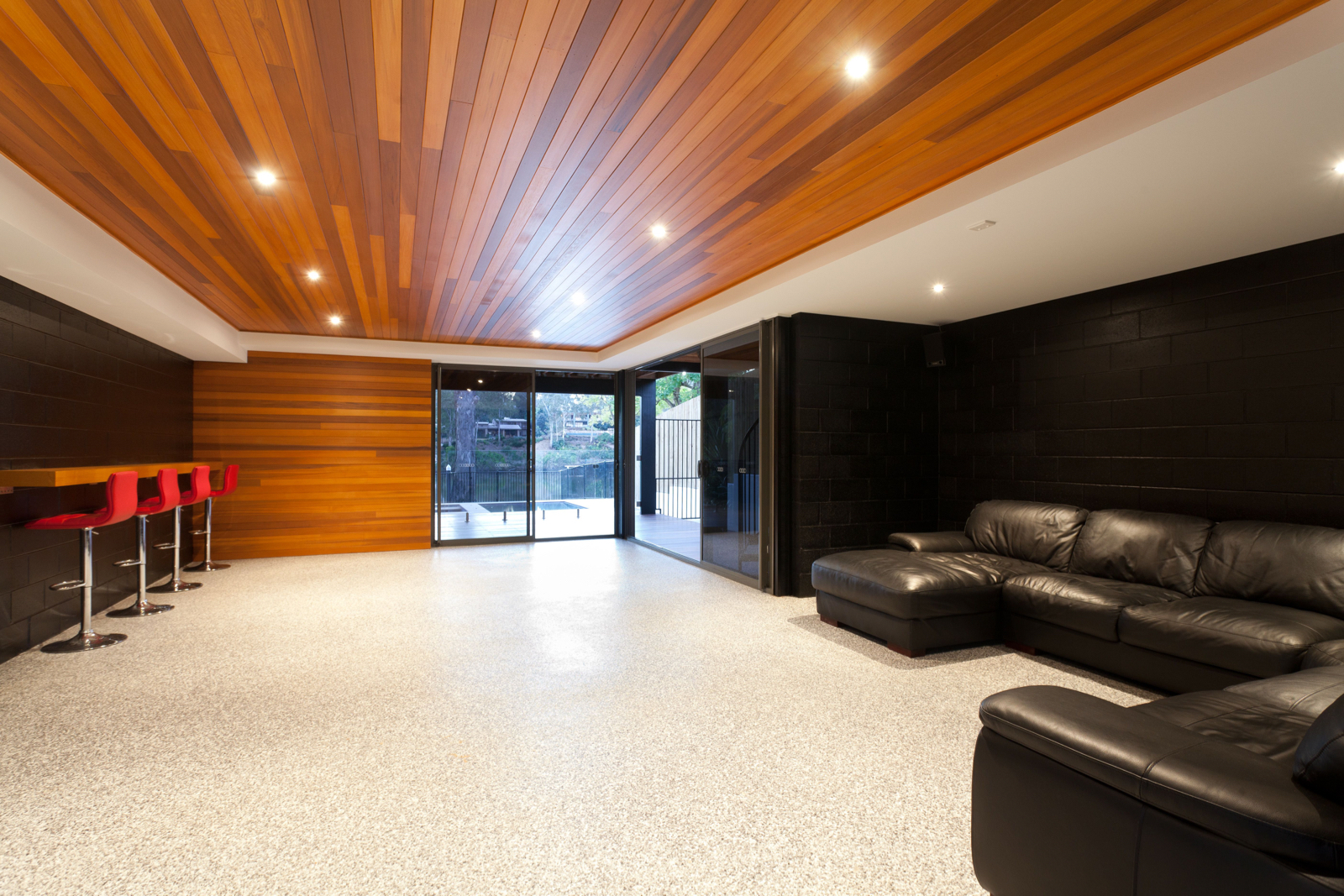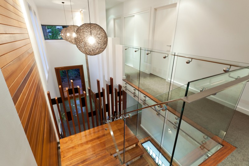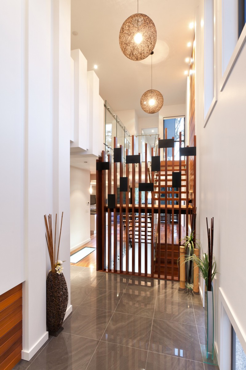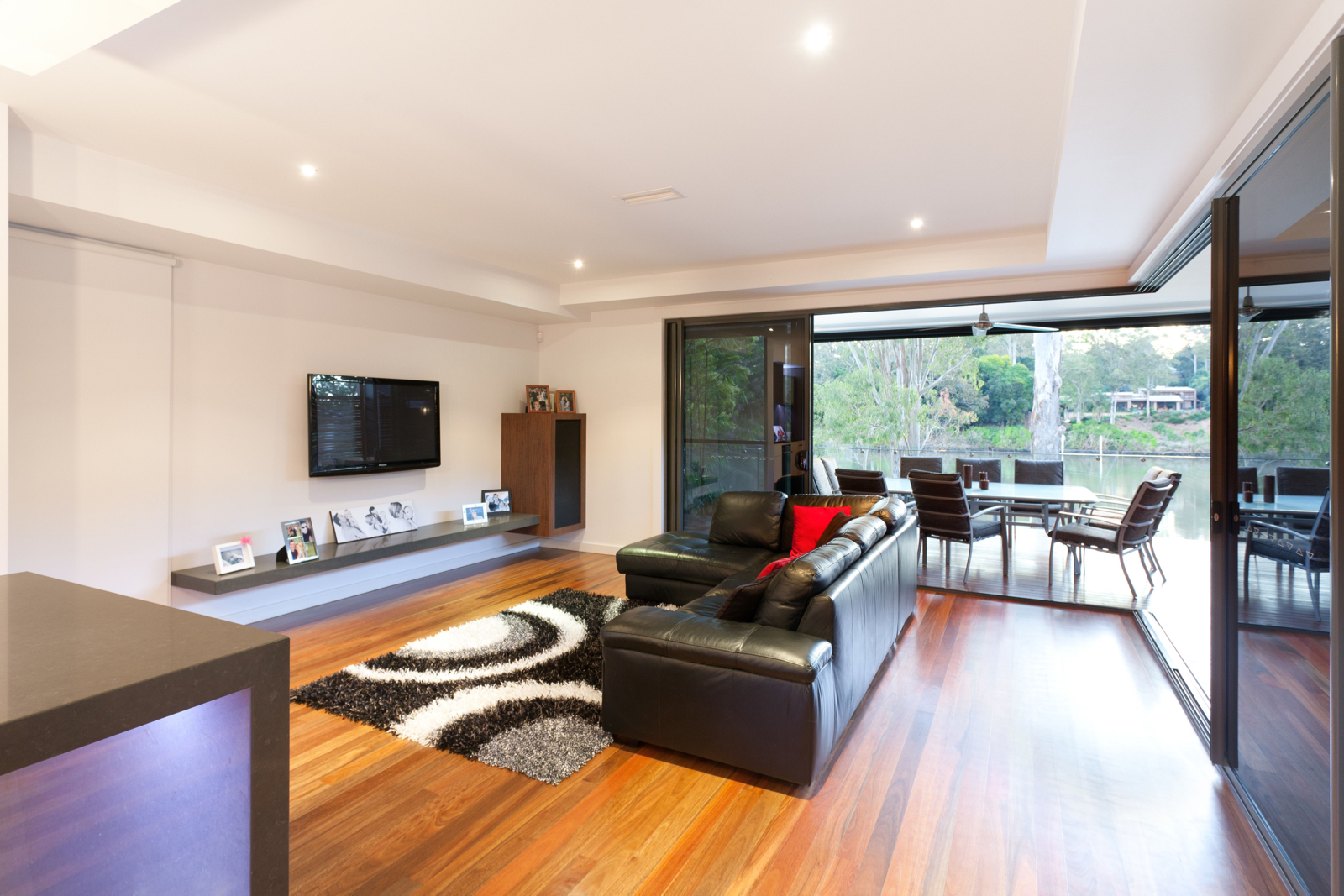 Stepping inside, this metropolitan style is continued, with a striking timber art installation separating the foyer from the main staircase and a glass panel that has been set into the floor allowing visitors to literally walk over countless bottles of wine and champagne in the cellar below. All living, dining and casual entertaining plays out on this central floor, where an open plan design combined with plentiful windows, louvers and banks of sliding glass doors ensure the preservation of not only natural light and breezes, but the wonderful river views. Perfectly complementing its surrounds, the kitchen blends functionality with European designer style to great effect. Expansive charcoal stone bench tops provide a clean, streamlined look which is supported by capacious cabinetry in white and timber veneer. There is a butler's pantry with sink and second dishwasher for effortless entertaining, while stainless steel appliances including in-wall espresso machine complete the gourmet experience.