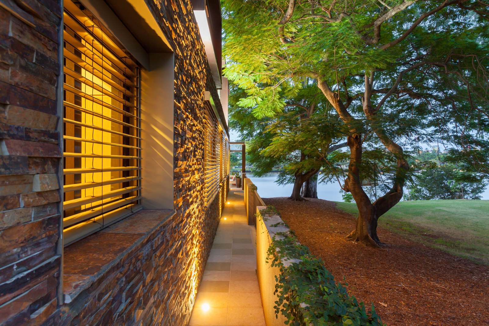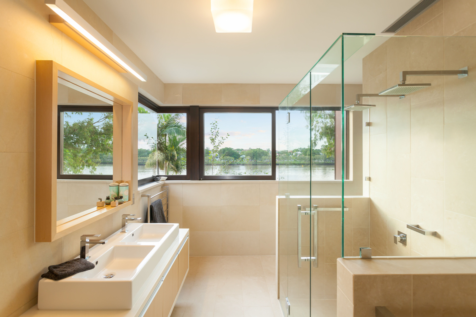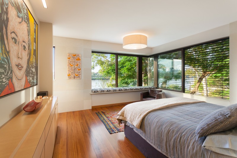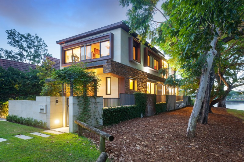 Intuitive interior spaces have also drawn maximum usability from the floor plan delivering separate areas for a variety of pursuits including a media room, home office, children's/teenager's retreat, study and a library looking through the tree canopy at the river and park. Upstairs four children's rooms have built-in veneered wardrobes and study nooks and make use of a large family bathroom complete with deep soaker bath. The separately zoned master suite is all about detail, from the bespoke cabinetry in the walk-in wardrobe, ensuite and the bedroom itself, to the stone-clad feature walls and stacking windows which retract giving the feeling of being suspended above the river.