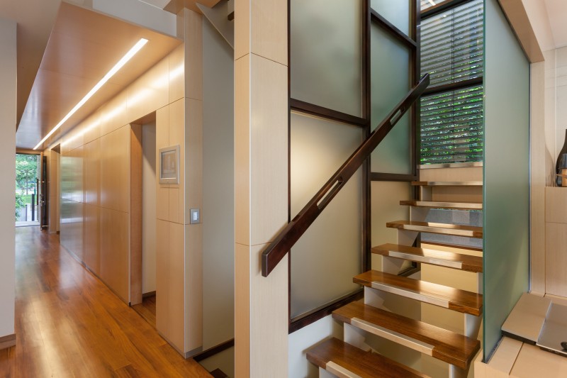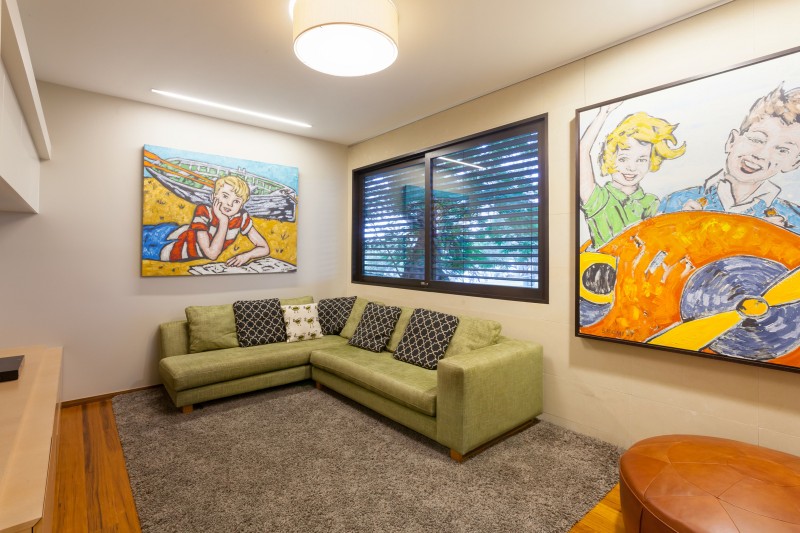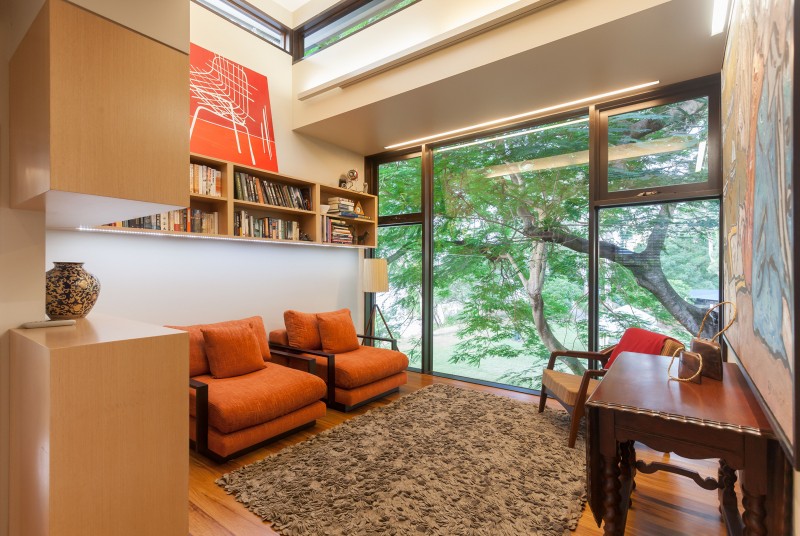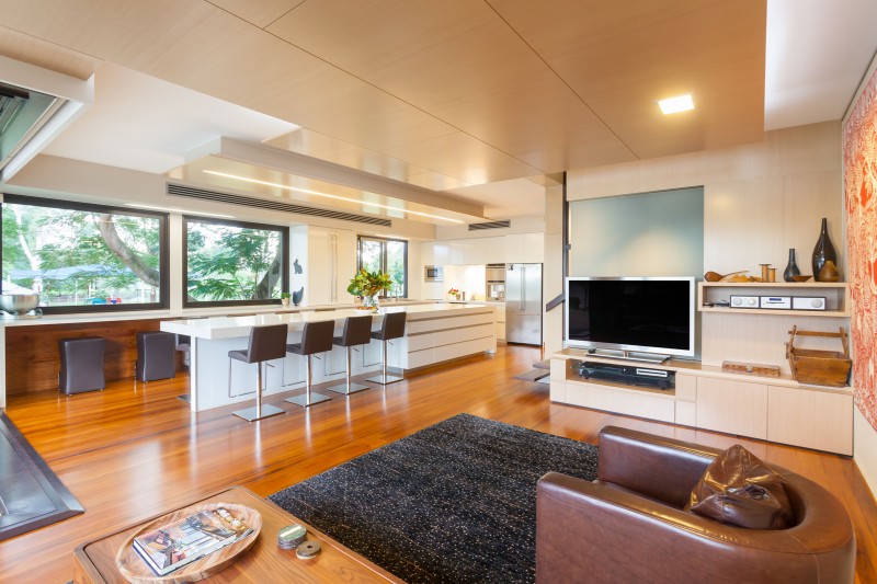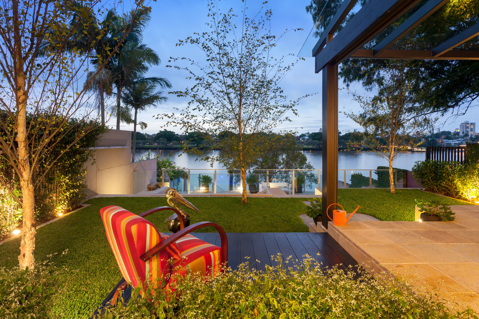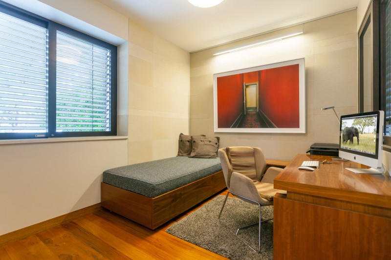 Intuitive interior spaces have also drawn maximum usability from the floor plan delivering separate areas for a variety of pursuits including a media room, home office, children's/teenager's retreat, study and a library looking through the tree canopy at the river and park. Upstairs four children's rooms have built-in veneered wardrobes and study nooks and make use of a large family bathroom complete with deep soaker bath. The separately zoned master suite is all about detail, from the bespoke cabinetry in the walk-in wardrobe, ensuite and the bedroom itself, to the stone-clad feature walls and stacking windows which retract giving the feeling of being suspended above the river.