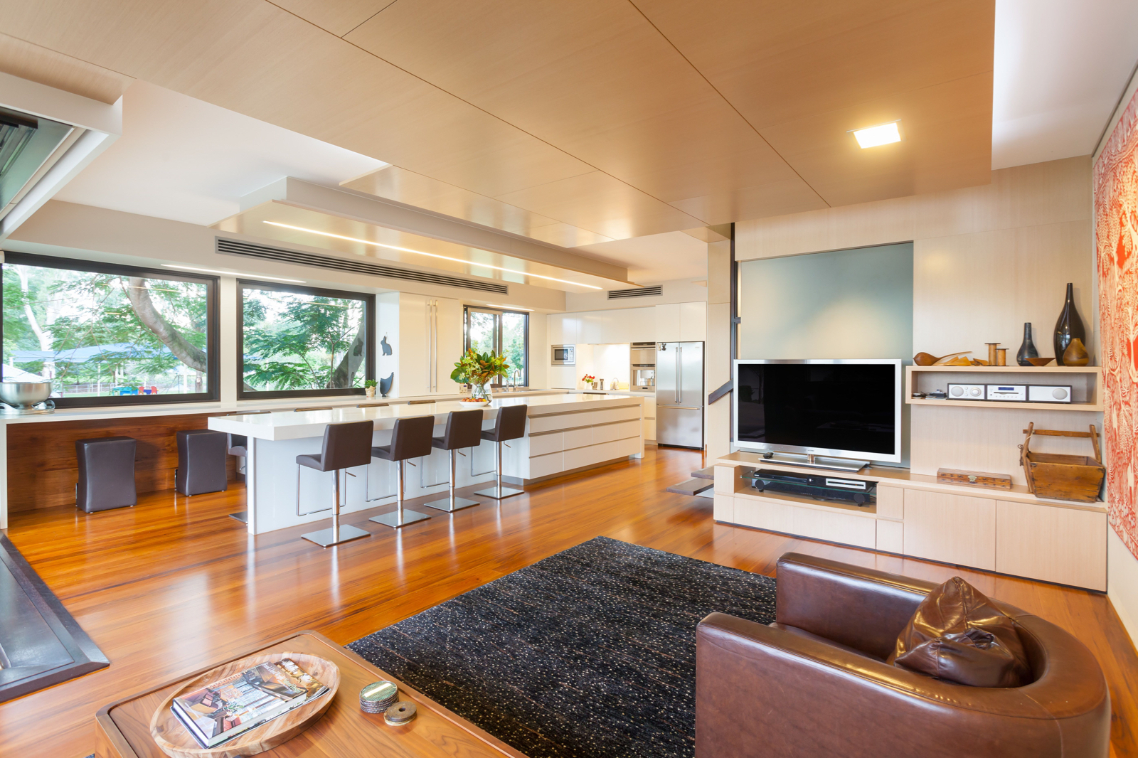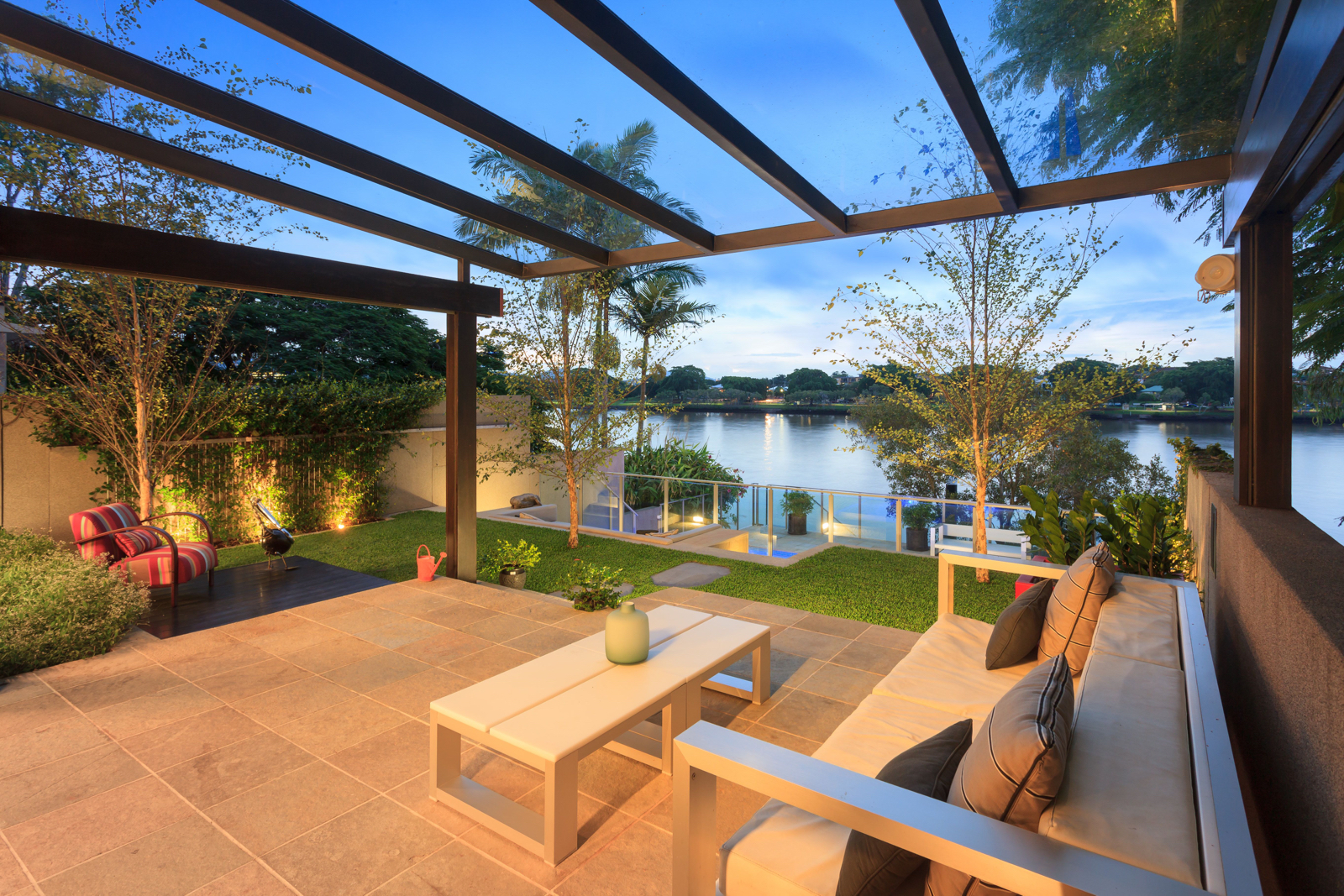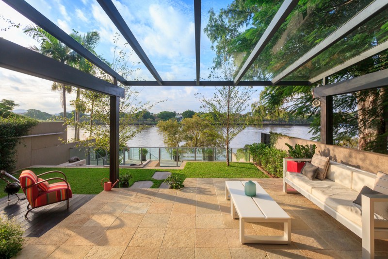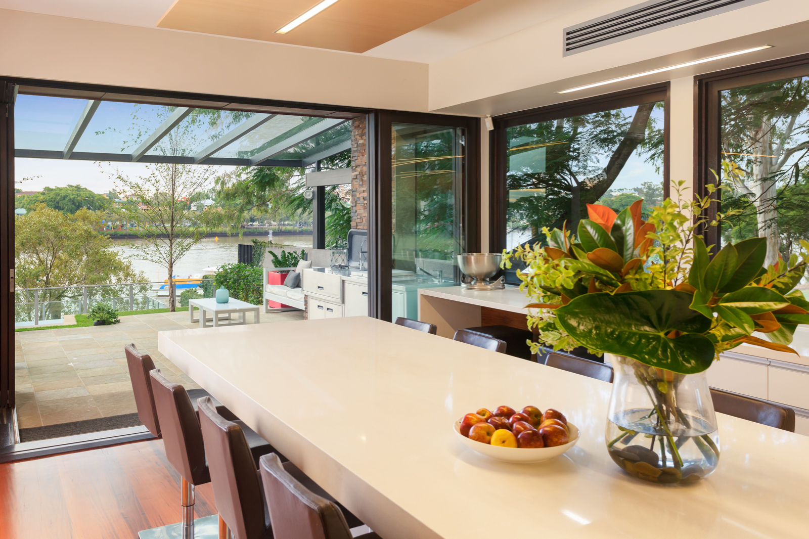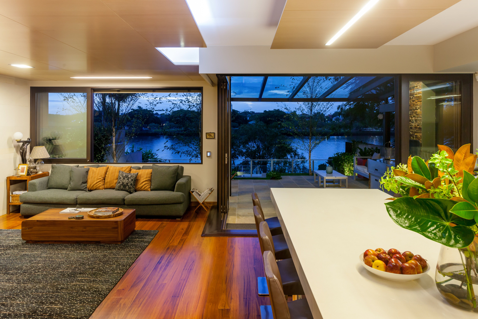 Custom-designed stacking windows, also play an important role, framing and shaping the surrounding views, while also ushering in plentiful light and natural breezes. Fitted with fully automated Vental blinds allows control of views, light and privacy at the touch of a button. These high impact architectural features are showcased in the generous open plan living area, which flows out to a glass covered terrace, lawn and pool before leading down to the water's edge where a pontoon allows easy access to the river beyond.