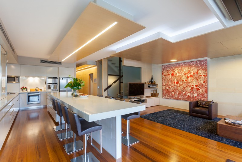 In keeping with modern design the stylish and functional kitchen enjoys European appliances, a 5.2 m stone-topped bench designed for seating ten is perfect for entertaining whilst maintaining your connection to the river and park. Such is the triumph of the design this home boasts a butler's pantry, powder room, breakfast bar and plentiful storage all seamlessly integrated whilst remaining sleek and minimalist.