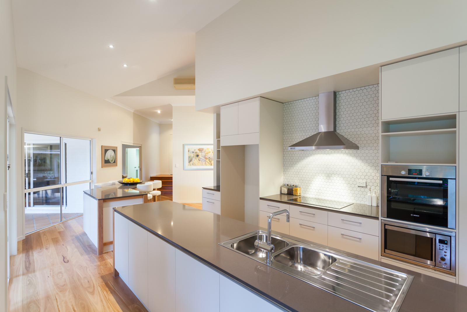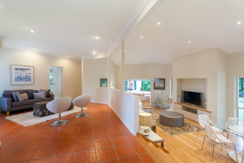 The just-completed kitchen is the centre point of the home, with the extensive layout more than capable of servicing the adjacent alfresco area and nearby dining zone. Very much a multifaceted installation, it includes capacious cabinetry, a standalone breakfast bar, an appliance centre and quality European appliances. Stone bench tops and a fabulous tiled splash back complete the look and work in well with the new Blackbutt floors and fresh paint scheme that unify the rest of the house. Multiple areas for living and relaxing are presented throughout with the entire central living area having been completely renovated by award winning interior designers.