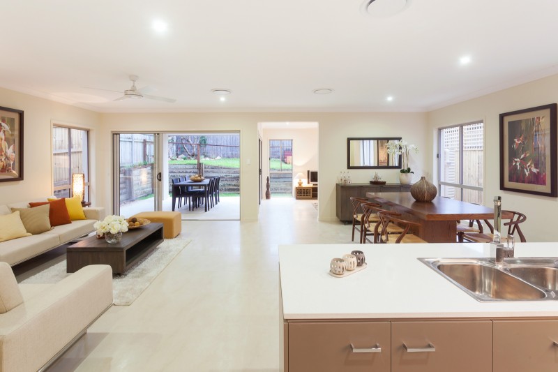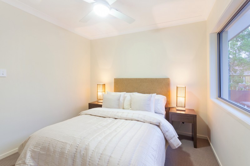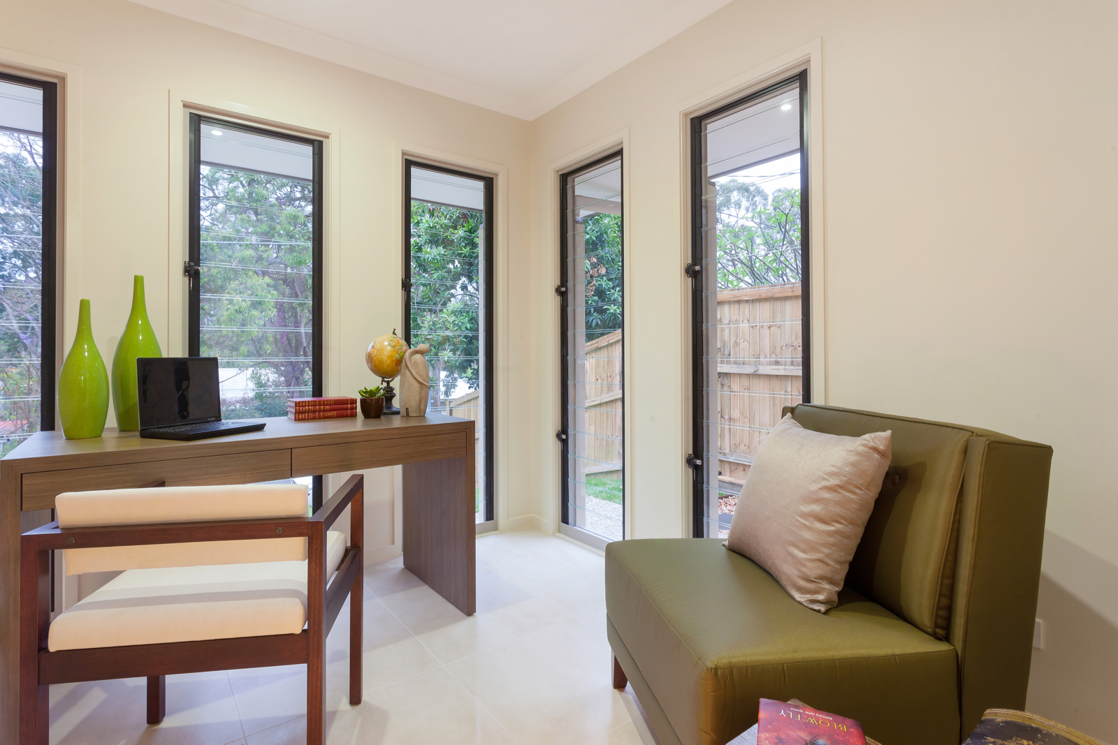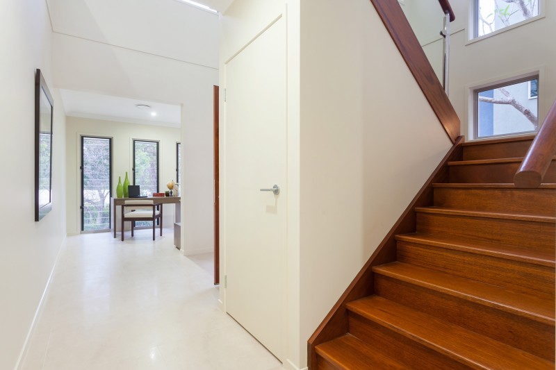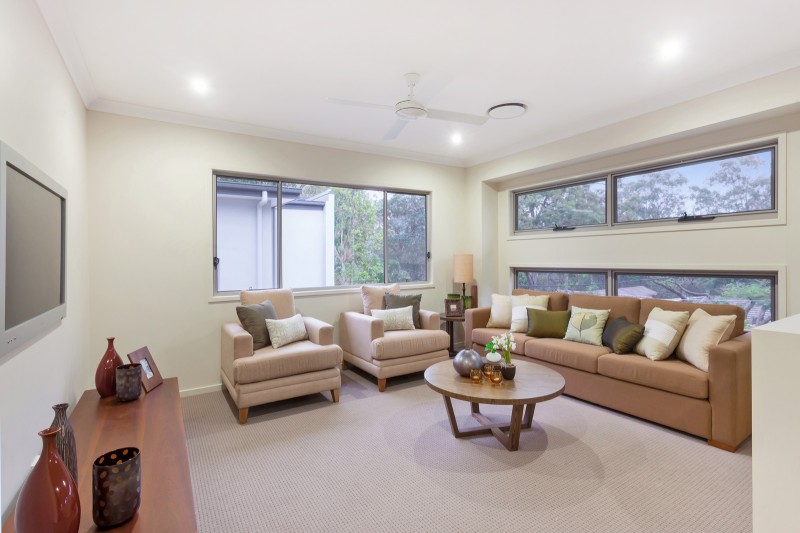 Indoors and out, neutral finishes bring timeless appeal, while quality fittings and fixtures, including Caesarstone bench tops and timber veneer cabinetry all contribute to the polished, sophisticated feel. Additionally, a judicious use of both translucent glass and high-set windows ensures maximum light and natural airflow throughout the home, without compromising privacy.