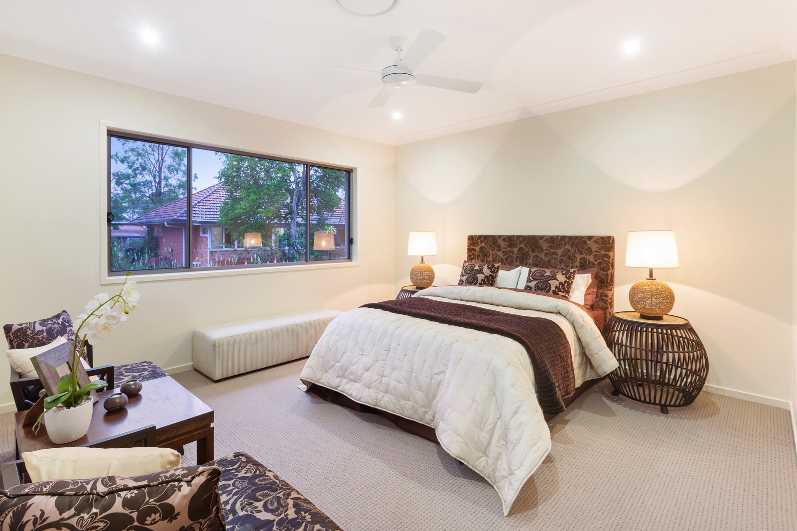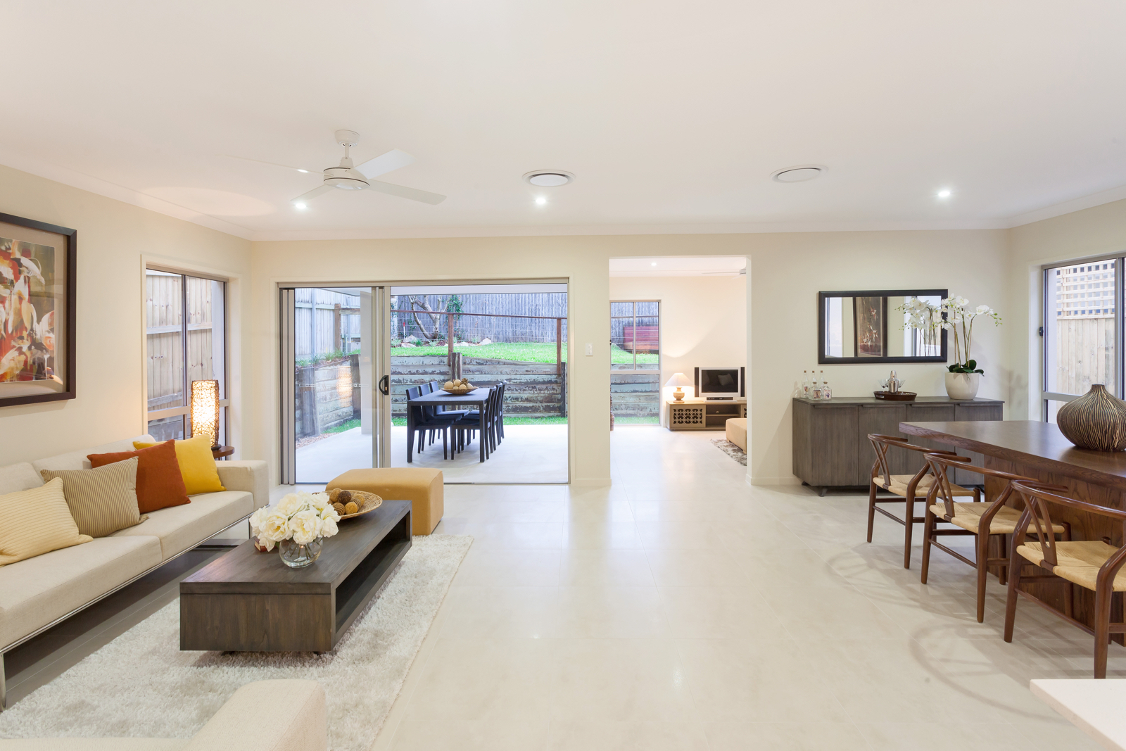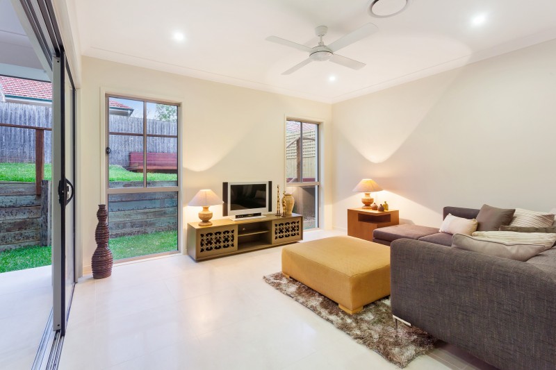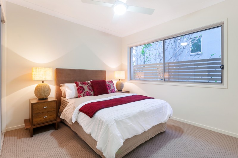 Indoors and out, neutral finishes bring timeless appeal, while quality fittings and fixtures, including Caesarstone bench tops and timber veneer cabinetry all contribute to the polished, sophisticated feel. Additionally, a judicious use of both translucent glass and high-set windows ensures maximum light and natural airflow throughout the home, without compromising privacy.