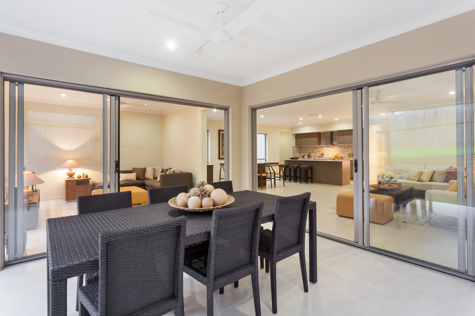 Surrounded by space for living and dining, the streamlined kitchen makes a strong style statement in the main living area, with rich mocha tones, stainless steel appliances, plentiful cabinetry and a walk-in pantry. Stacking doors allows for easy integration with the outdoor living room, while the adjacent media zone brings a separate space for more sedentary pursuits.